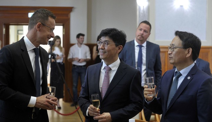 Címlapkép: Szijjártó Péter külgazdasági és külügyminiszter (b), Ri Ki Jeon, a dél-koreai Bumchun Precision Co. Ltd. elnöke (k) és Csö Kju Szik, Dél-Korea budapesti nagykövete beszélget a Bumchun Precision Hungary Kft. beruházásáról tartott sajtótájékoztatón a Külgazdasági és Külügyminisztériumban 2019. július 24-én. (Fotó: MTI/Kovács Attila)