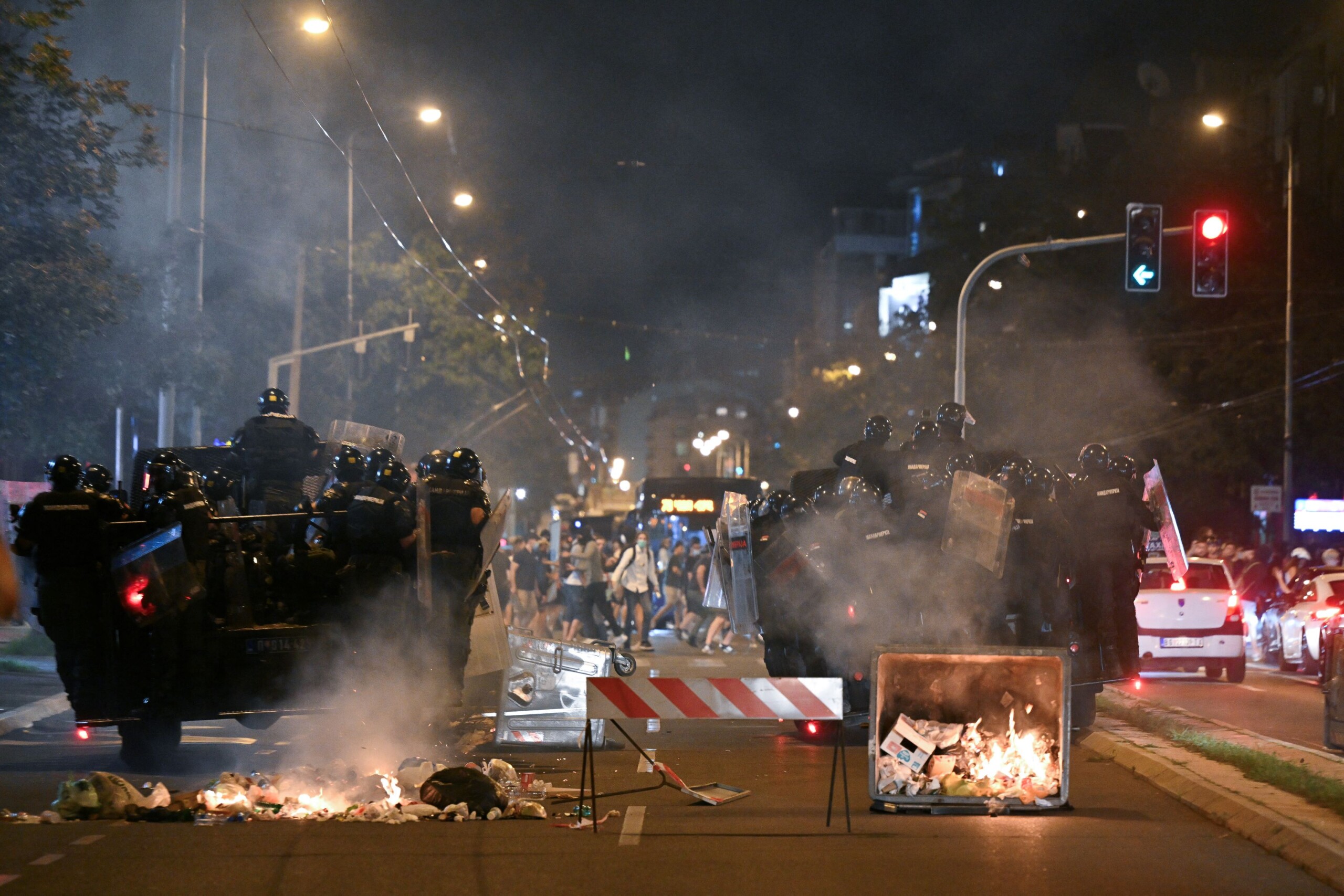 "A rendőri erőszak új szintre lépett" – véli egy szerb újságíró, aki szerint a rendőrség gyakorlatilag feloszlatta magát, és a kormánypárt magánbiztonsági szolgálatává vált. Aleksandar Vučić szerb elnök kormányzó pártja focihuligánokból verbuvált verőlegénycsapatokat is bevet az új választást követelő tüntetők ellen. (Forrás: Telex, fotó: AFP)