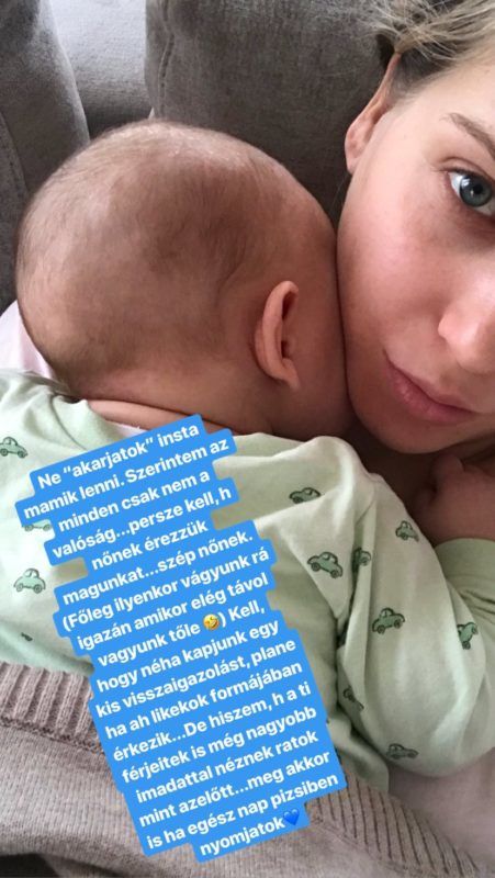 “Ne akarjatok Insta mamik lenni. Szerintem az minden, csak nem a valóság. Persze kell, hogy nőnek érezzük magunkat, szép nőnek. Főleg ilyenkor vágyunk rá igazán, amikor elég távol vagyunk tőle. Kell, hogy néha kapjunk egy kis visszaigazolást, pláne, ha az like-ok formájában érkezik. De azt hiszem, hogy a ti férjeitek is még nagyobb imádattal néznek rátok, mint azelőtt, még akkor is, ha egész nap pizsiben nyomjátok” – írta a fiatal anyuka az Instagramján.