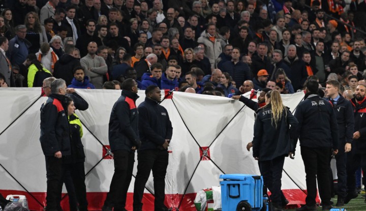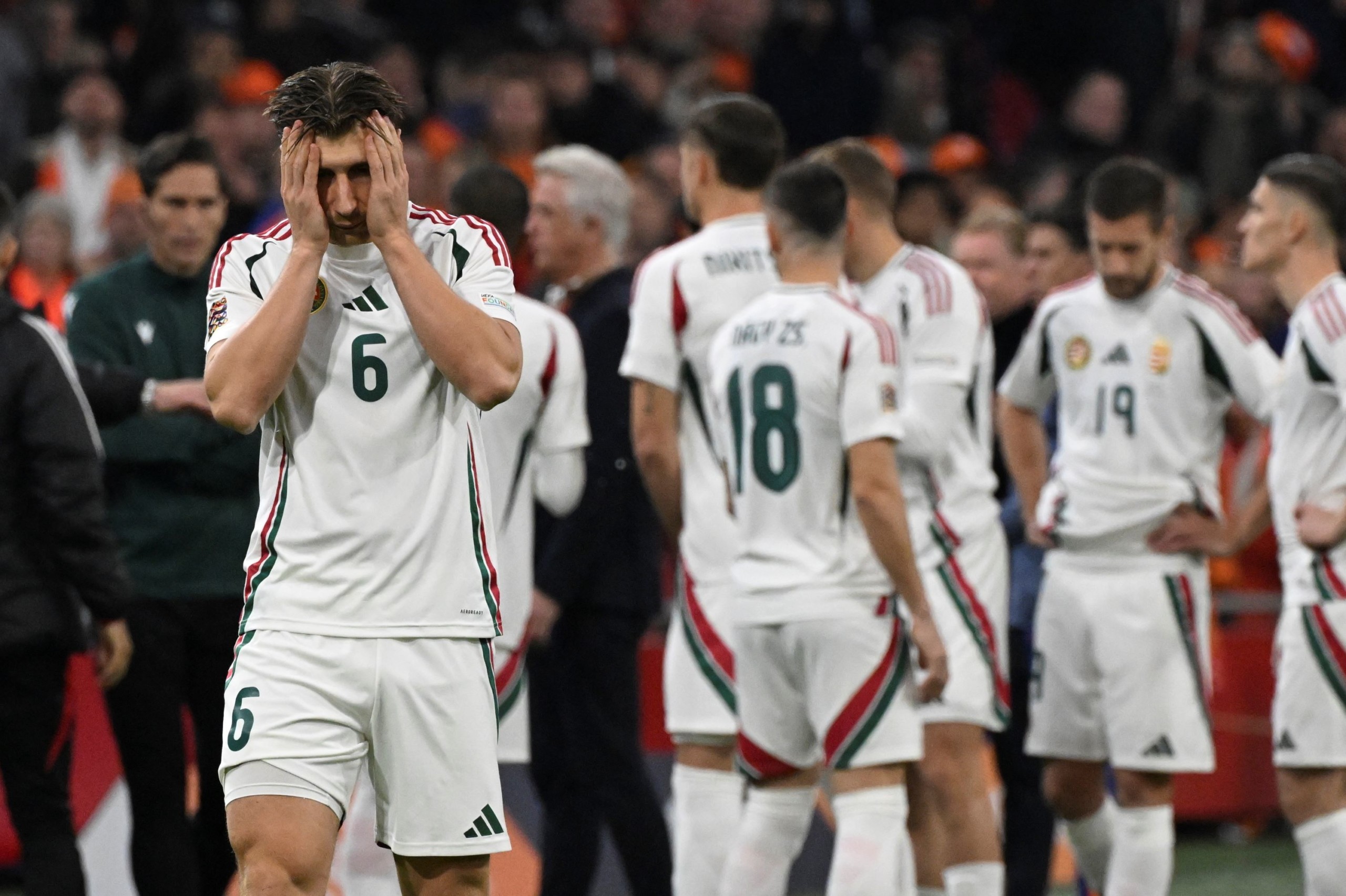 Szalai Ádám rosszul lett a magyar kispadon, így hat perccel a kezdés után félbeszakadt az amszterdami holland-magyar mérkőzés a labdarúgó Nemzetek Ligájában. Marco Rossi szövetségi kapitány pályaedzőjéhez - a válogatott volt csapatkapitányához - azonnal megérkezett az orvosi segítség, majd mintegy negyedóra után hordágyon vitték ki a játéktérről. "Szalai Ádám állapota stabil, eszméleténél van. Mentővel elszállították az egyik amszterdami kórházba kivizsgálásra" - írta X-en a Magyar Labdarúgó Szövetség. A közvetítés idején az M4 Sport a holland televízióra hivatkozva azt közölte, Szalait újra is kellett éleszteni. Helyszíni értesülések ezt azóta cáfolták. Képünkön a magyar játékosok, elöl Orbán Willi. Fotó: MTI/Koszticsák Szilárd