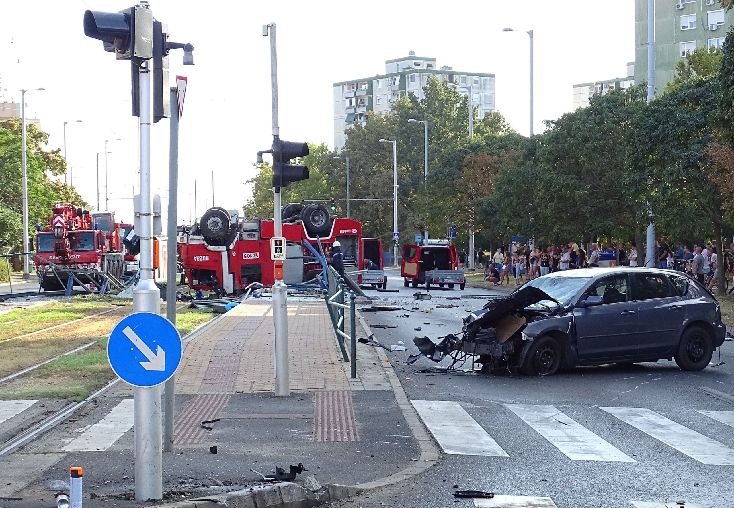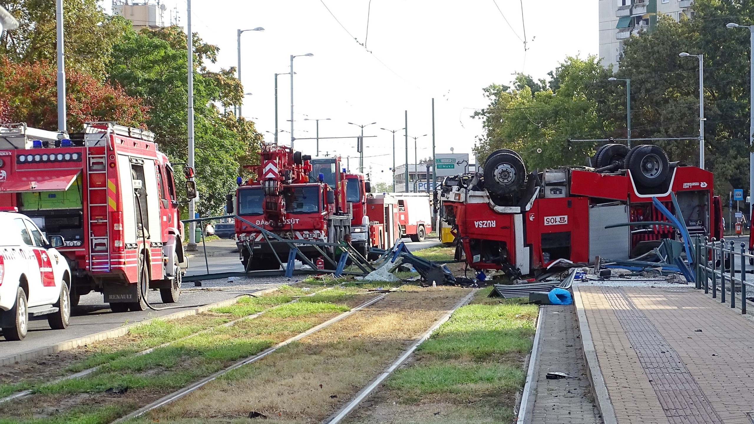 Fotókon a Szegeden felborult tűzoltóautó, ami letarolta a villamosmegállót