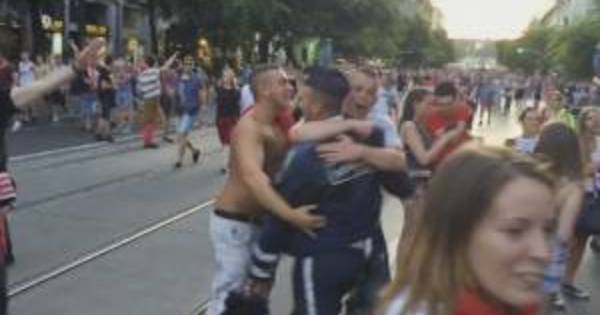 Szurkolókkal bulizott a rendőr a budapesti fiesztában az izlandi meccs után