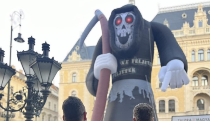 Több méter magas kaszás bábut fújtak fel az Operaház előtt