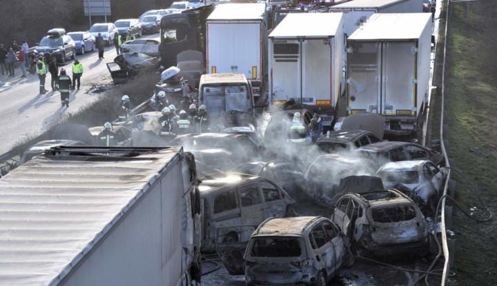 Szombaton a sztrádán a Hegyeshalom felé vezető oldalon a 31-es kilométernél 5 kamion és 37 személyautó ütközött össze, egy ember meghalt, 39-en megsérültek, több jármű kigyulladt.