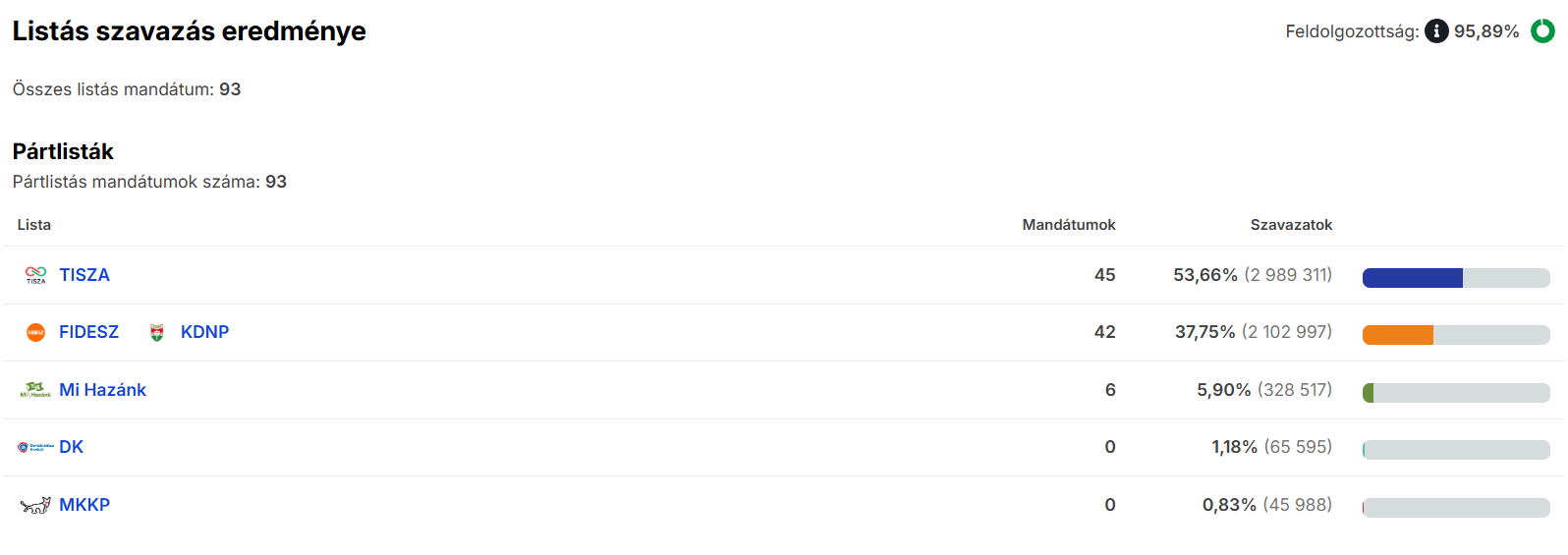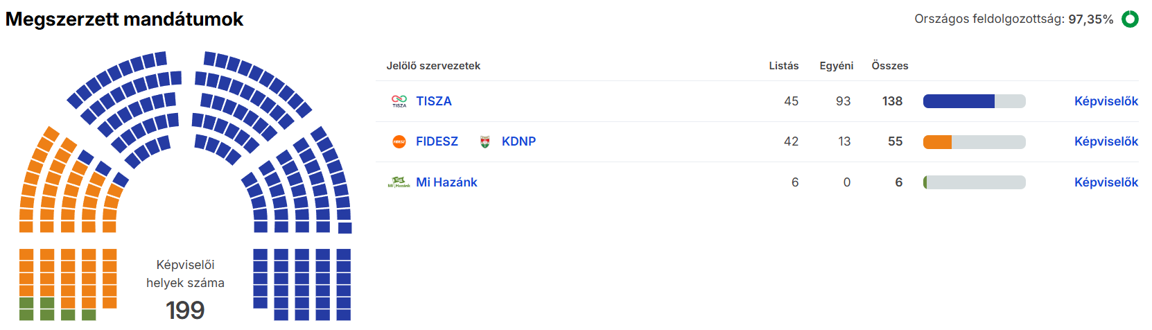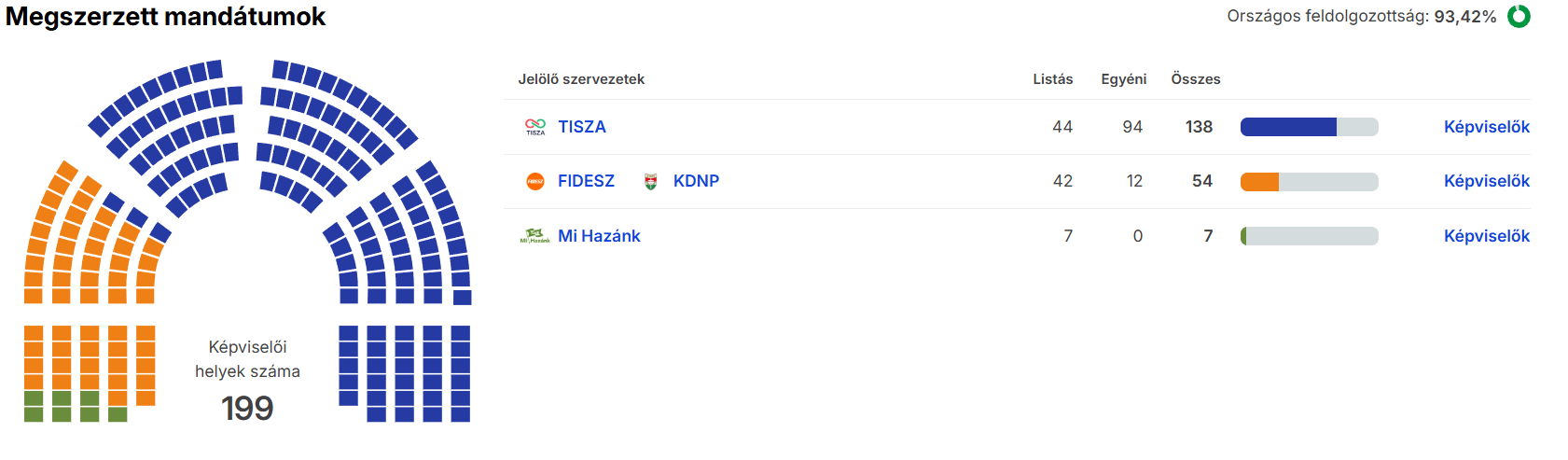 A Tiszának 138, a Fidesznek 55 mandátuma van a jelenlegi feldolgozottságnál. Ez azt jelenti, hogy kétharmaddal kormányozhat a Tisza. A Mi Hazánk pedig bejutásra áll.