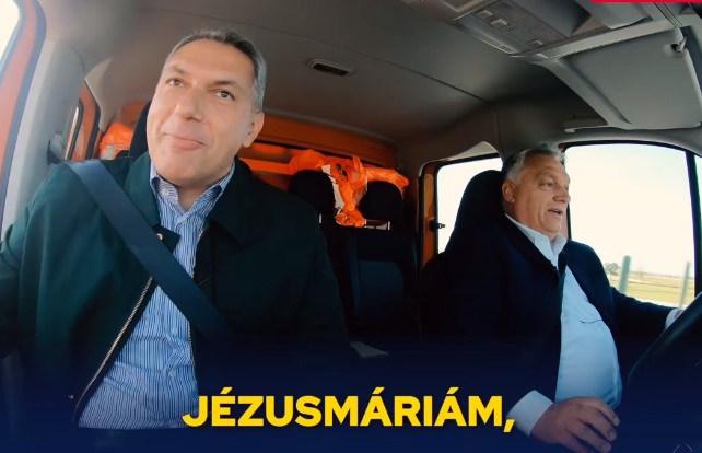Videón, ahogy Orbán tesztvezetésre visz egy munkásautót Lázárral