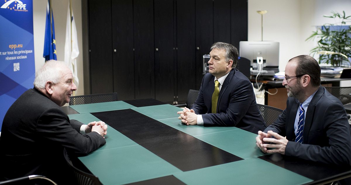 A meglepett Orbán egy pillanatra – de tényleg csak egy másodpercig tartóan –tétovázik, nem tudva, hogy kezet fogjon vagy sem, végül szívélyesen, kézfogással üdvözli egymást a két vezető.