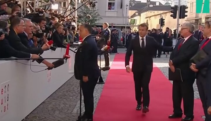 Kamerák örökítették meg, amint a francia elnök meglepi az éppen interjút adó Orbán Viktort a salzburgi EU-csúcson.