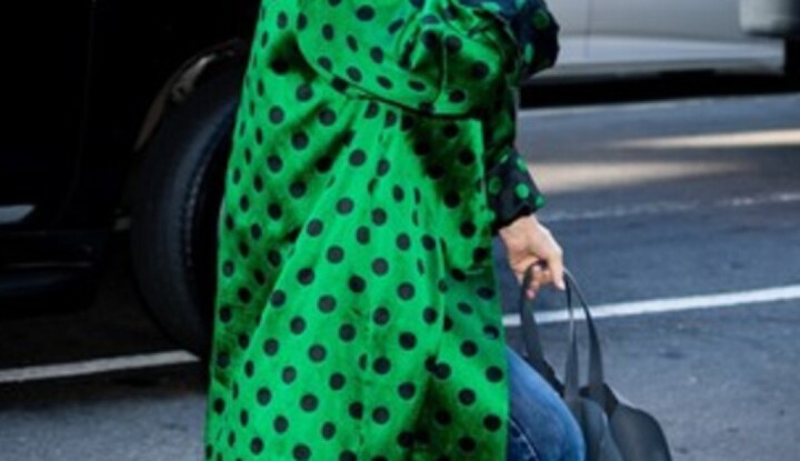 Meryl Streep New Yorkban egy sötétzöld, pöttyös kabátban érkezett egy manhattani szállodához, és ezzel ráerősített a most újra felkapott pöttyös kabát trendre.