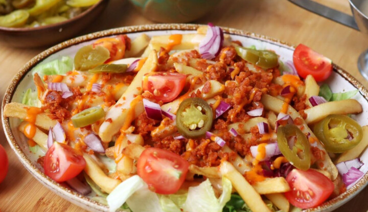 Vegán loaded fries gyorsan: ropogósra sült krumpli magyaros feltétekkel és krémes szósszal, ami egyszerre laktató és látványos.