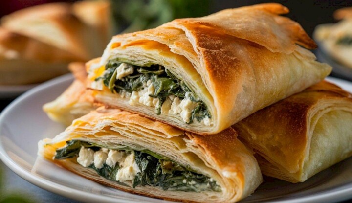 A meleg, sós rétestészta, valamint a spenót, a mentalevelek és a feta kombinációja szinte egyből a déli országba repít.