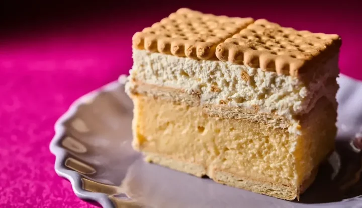 Háztartási keksz közé selymes vaníliás krém és könnyű tejszínhab kerül, a tetején újra keksz.