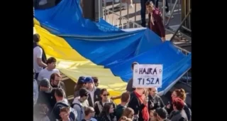 Hatalmas ukrán zászló Magyar Péter tegnapi menetén: Orbánék fizették a provokátorokat?