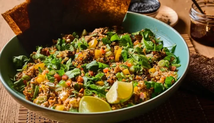 Olyan, mint egy dekonstruált sushi bowl: pirult rizs, chilis tonhal és játékos textúrák egy látványos fogásban.