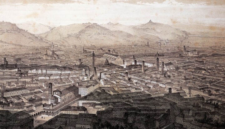 A középkori Bologna látképe látványosan eltér a maitól: sűrűn egymás mellé épített, száz méter körüli tornyok emelkednek az óváros fölé, mintha egy modern metropolisz korai változatát látnánk.