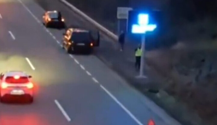 Egy felüljáróról készített felvétel, amin egyszerre látható az új V-16-os vészvillogó és a hagyományos elakadásjelző háromszög, mindent elmond.