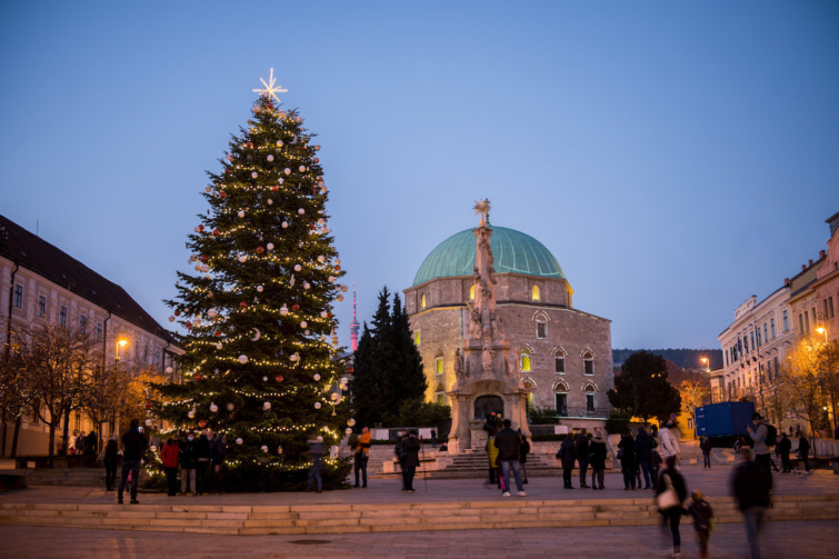 A kivilágított mindenki karácsonyfája a pécsi Széchenyi téren advent első vasárnapján, 2020. november 29-én. MTI/Sóki Tamás