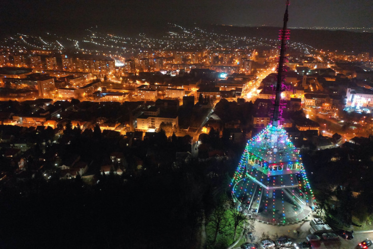 Az ünnepi fényfüzérekkel kivilágított, karácsonyfát formázó Avasi kilátó Miskolcon advent első vasárnapján, 2020. november 29-én. MTI/Vajda János