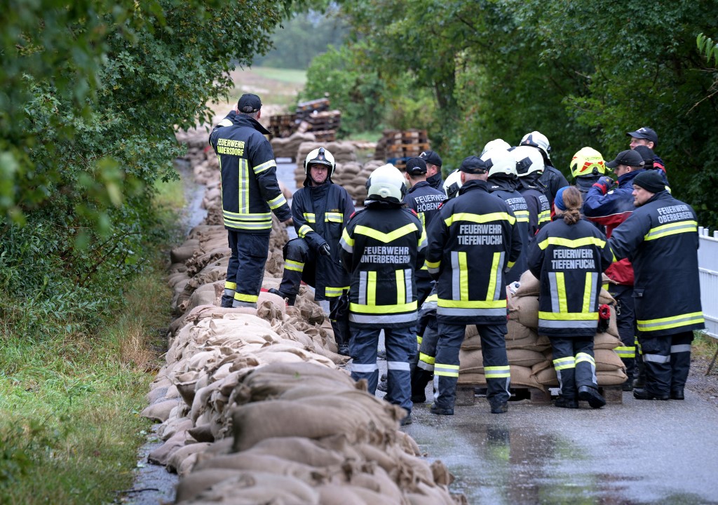 Hadersdorf am Kamp, Ausztria: Tűzoltók állnak a homokzsákok körül. Fotó: Roland Schlager/AFP