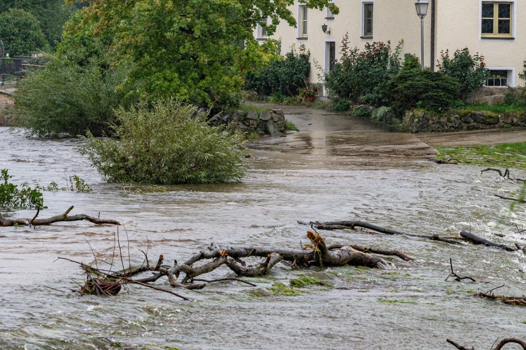 Bajorország, Cham: A Regen folyó áradása utakat tüntetett el. Fotó: Armin Weigel/AFP