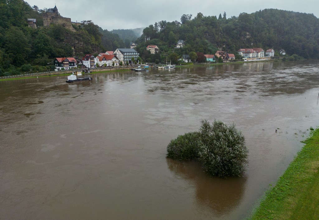 Az Elba árvíz alatt (drónfelvétel). A vízszint tovább emelkedik Szászországban. Kelet-Szászországban a legmagasabb riasztási szintet legkésőbb a hét közepére elérhetjük. Fotó: Jan Woitas/AFP