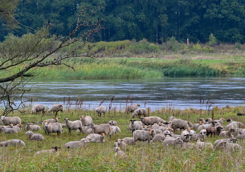 Juhok legelnek a Németország és Lengyelország határán húzódó Oder folyó közelében, ahol az árvíz veszélye fenyeget. Az Oder vízszintje itt, a Neisse és Oder folyók összefolyásánál két nap alatt körülbelül egy métert emelkedett, és elérte a 2,74 métert szeptember 16-án, 12 órakor. A Neisse, Oder és Elba vízszintje várhatóan a napokban tovább emelkedik. Fotó: Patrick Pleul/AFP