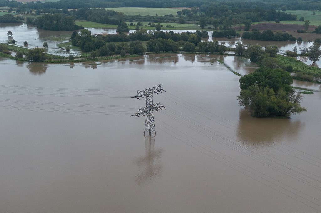 Egy elektromos oszlop magasodik ki a feláradt Neisse vizéből. Fotó: Paul Glaser/AFP