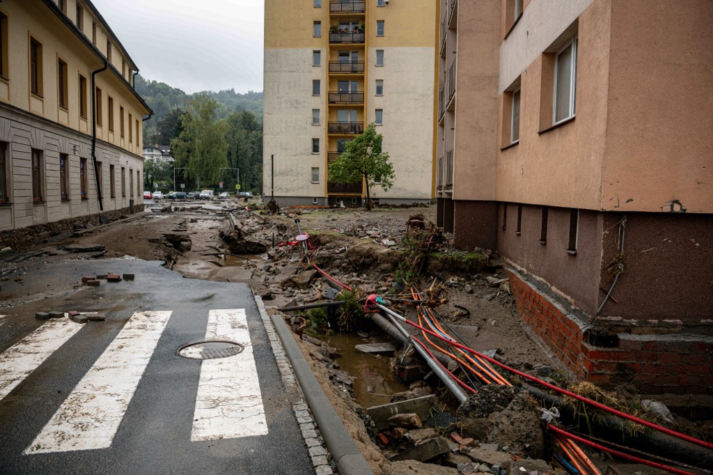 Jesenik, Csehország: Megsérült, elöntött utak láthatók a városközpontban az intenzív esőzések okozta áradás után. Fotó: Lukas Kabon/AFP