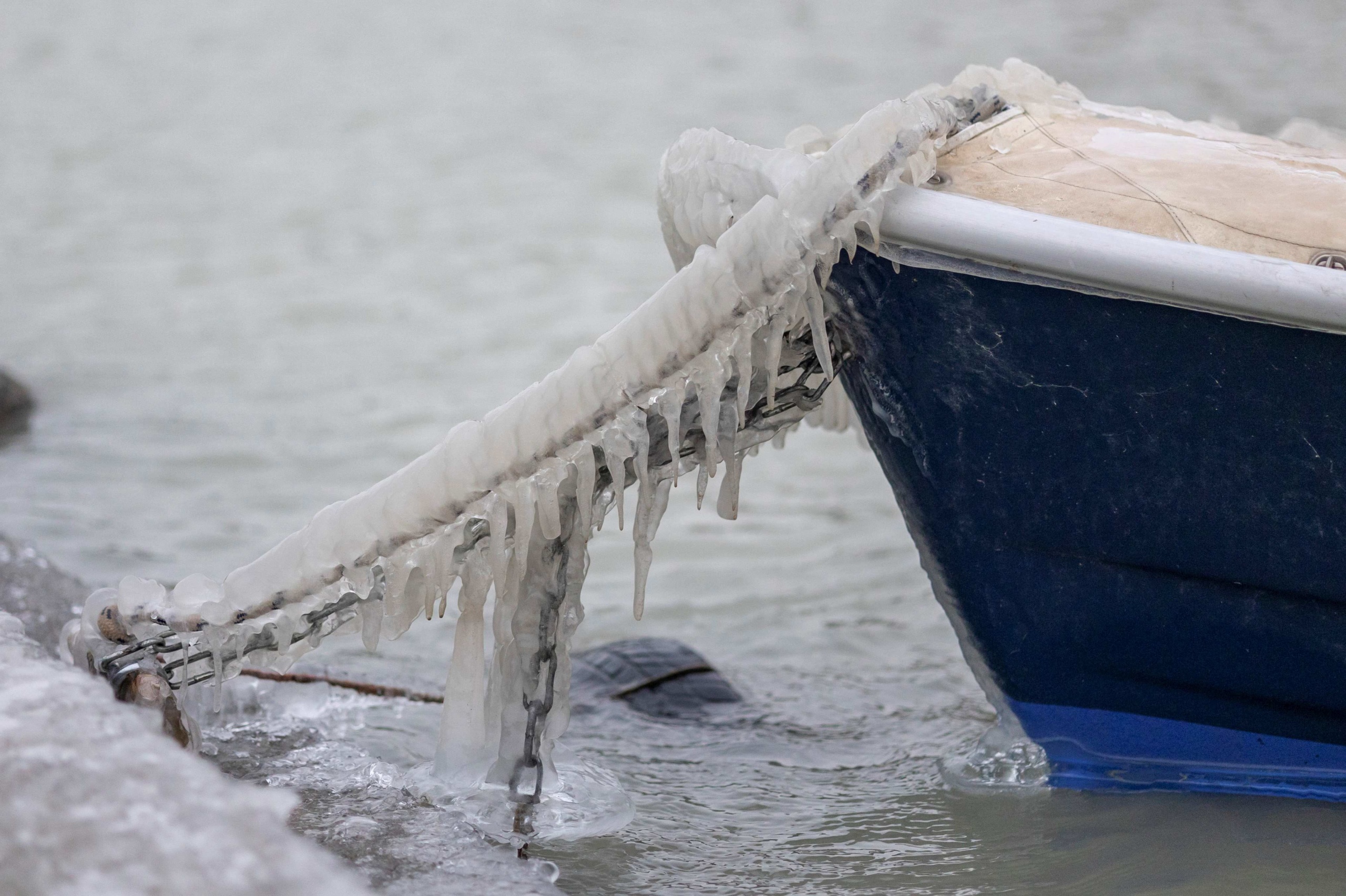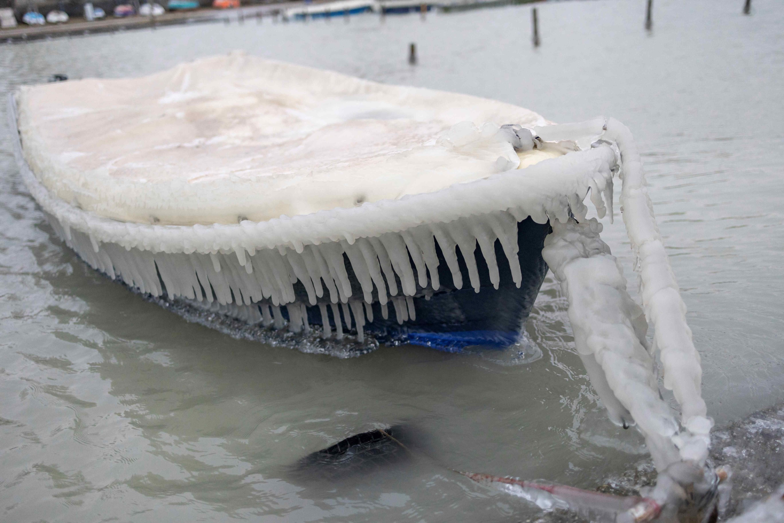 Jég borít egy csónakot a Balaton partján Fonyódnál Fotó: MTI/Varga György
