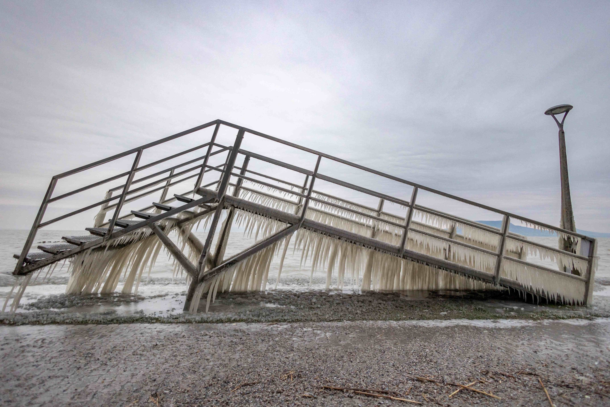 Jég borít egy lépcsőt a Balaton partján Fonyódnál, a bélatelepi strandon Fotó: MTI/Varga György