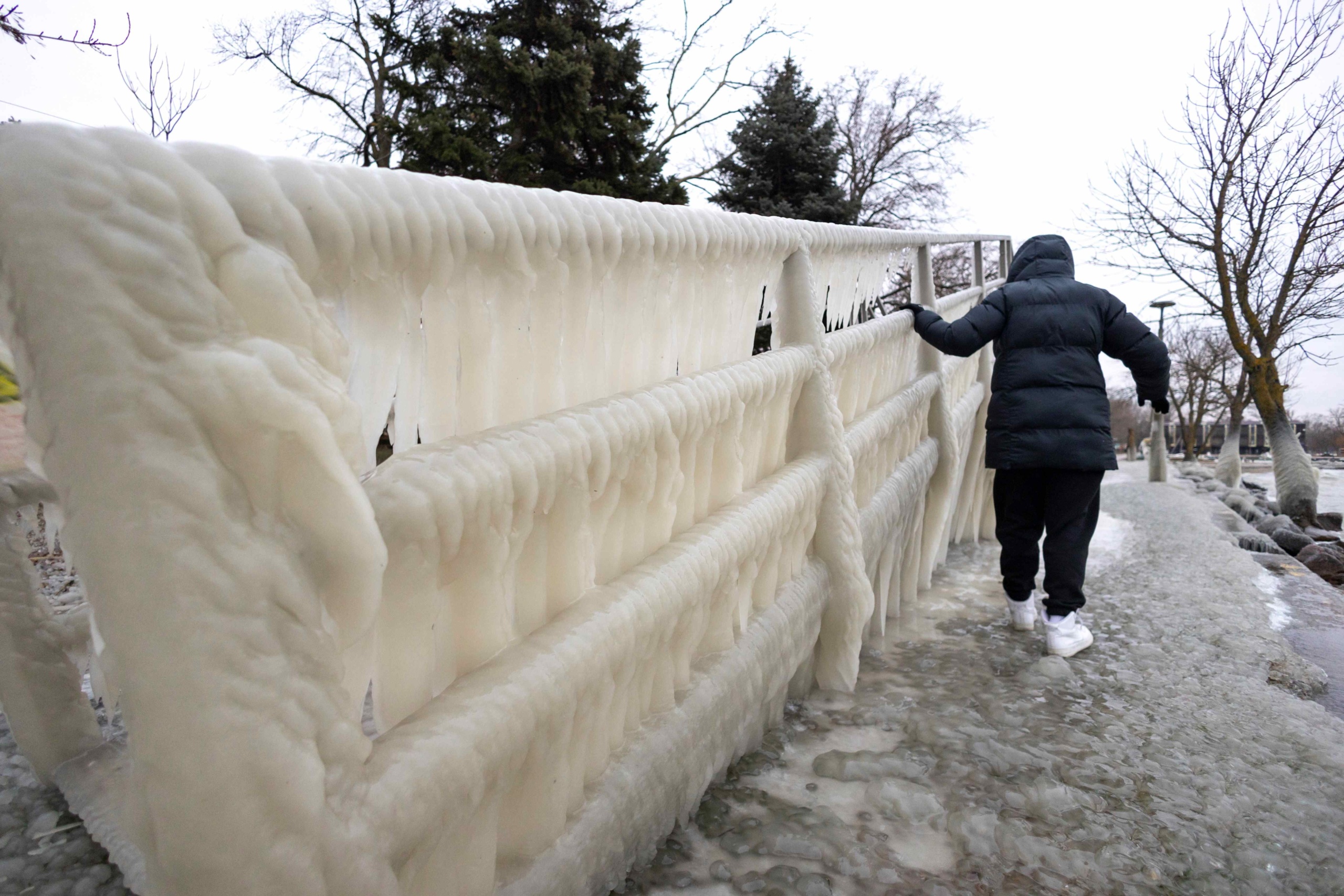 A heves szél miatt felcsapó hullámok és a hideg idő elképesztően látványos jégvilágot varázsolt a Balatonnál.