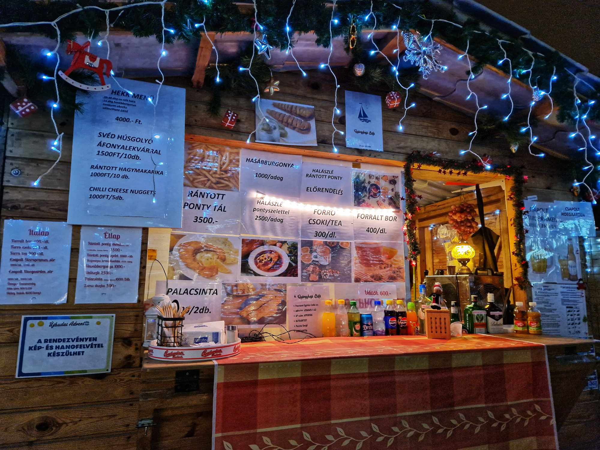 A rántott ponty tál 3500 forintba, a halászlé 2500 forintba, a forró csoki/tea decije 300 forintba kerül, és forralt bor már 400 forintos dl áron is kapható. 10 dbos svéd húsgolyót lekvárral 1500 forintért, hekk menüt 4000 forintért, egy adag sült krumplit pedig 1000 forintért ehetünk.