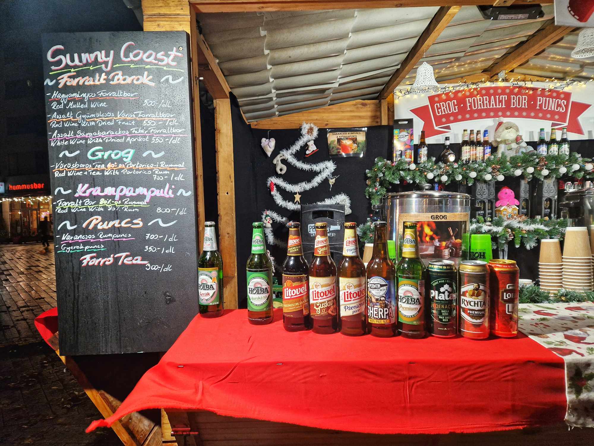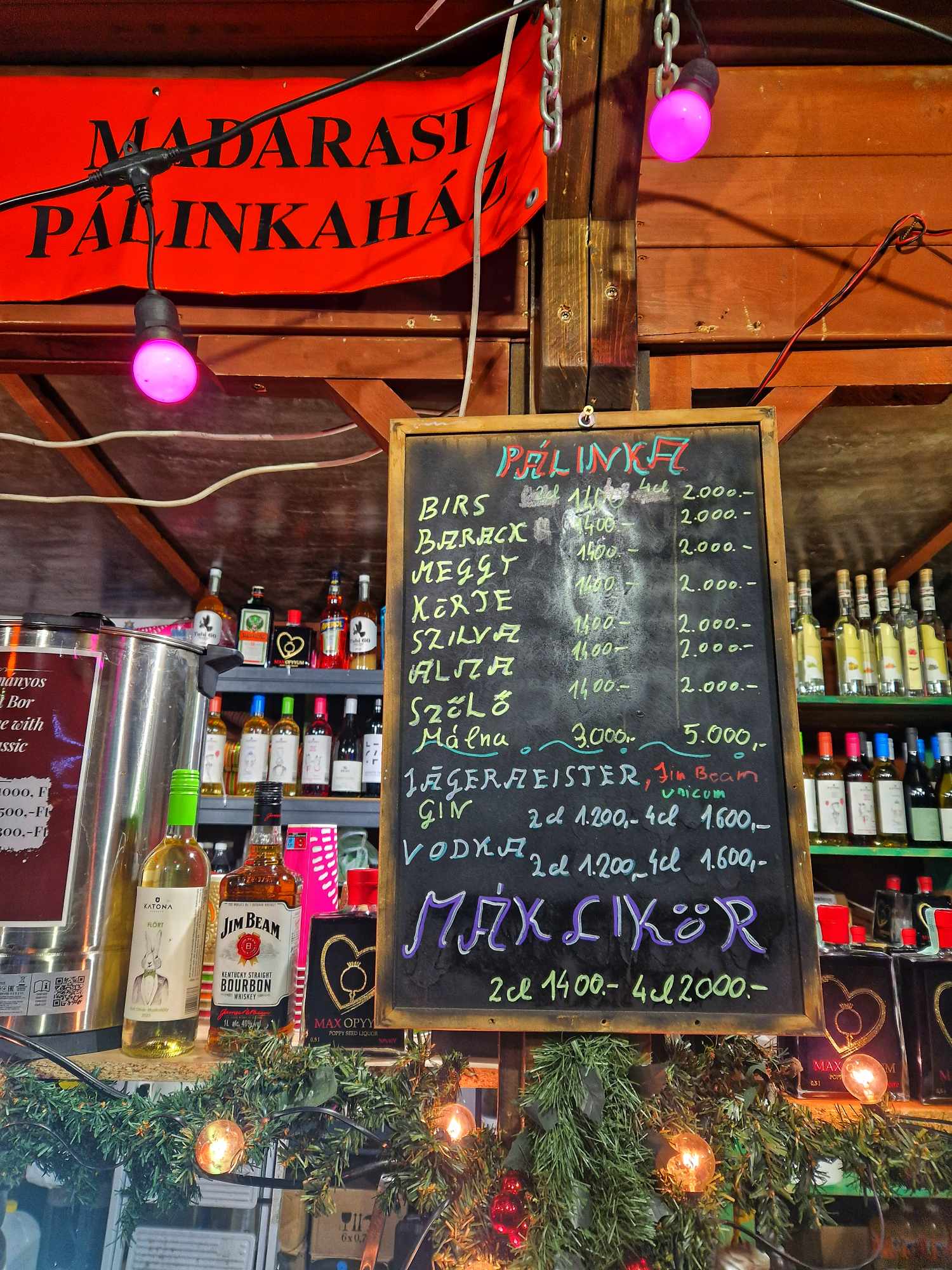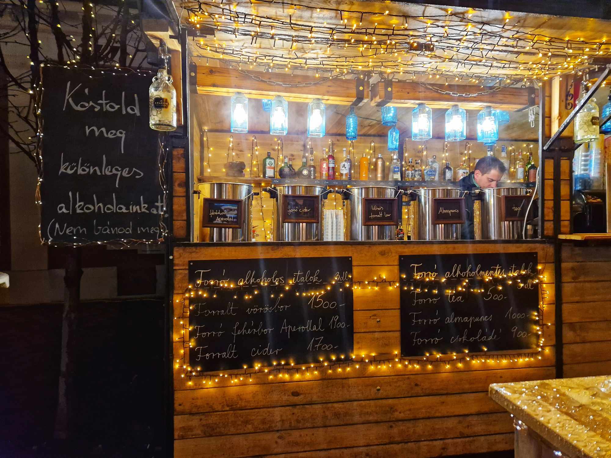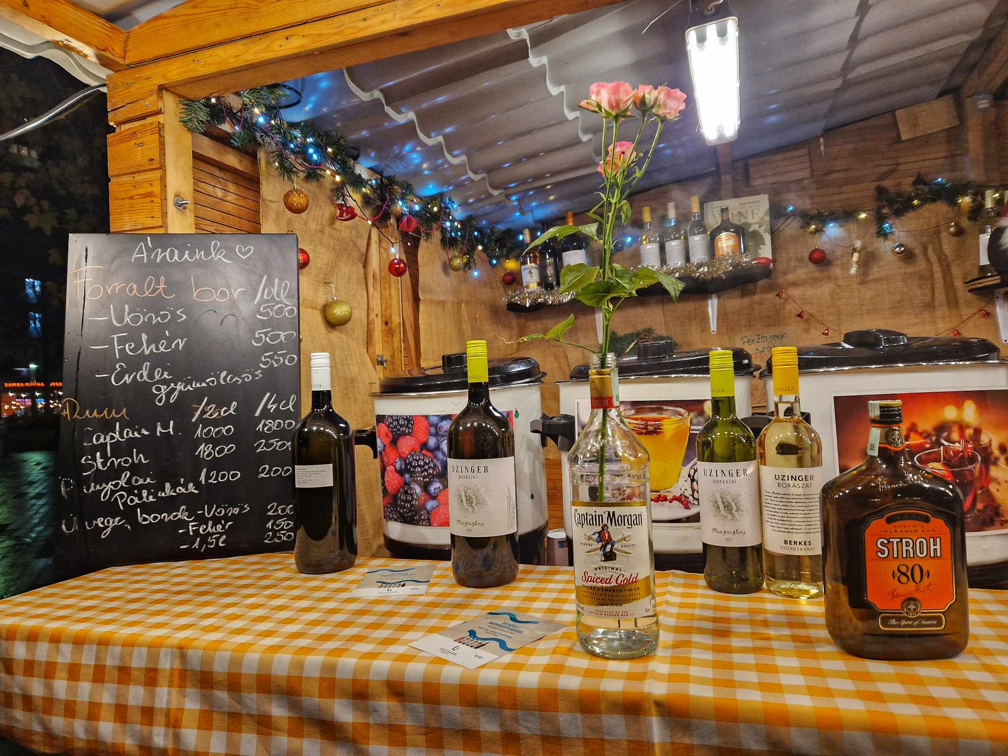Karácsonyi vásár a Corvin sétányon - 4 cent Captain Morgant 1800 forintért, 4 cent Panyolai Pálinkát 2000 forintért ihatunk meg.