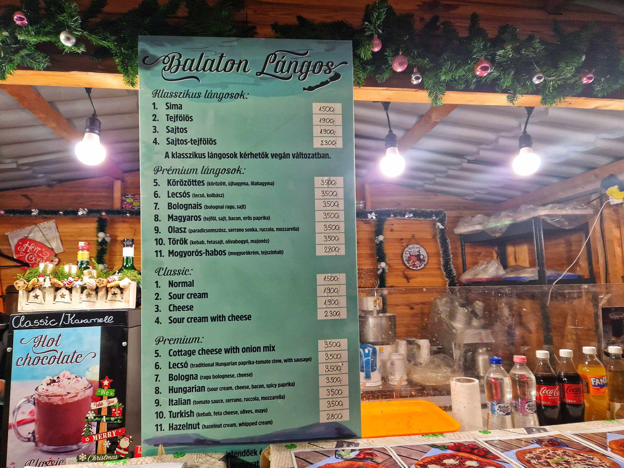 Adventi forgatag a Vároháza téren - A sima lángos 1900 forint, és a tejfölös is 1900 forintba kerül, a sajtos-tejfölösért viszont 2900 forintot kell fizetni. Az extrább lángosok, például a nutellás vagy a csülkös-káposztás lángos ára 3900- 4950 ft között alakul.