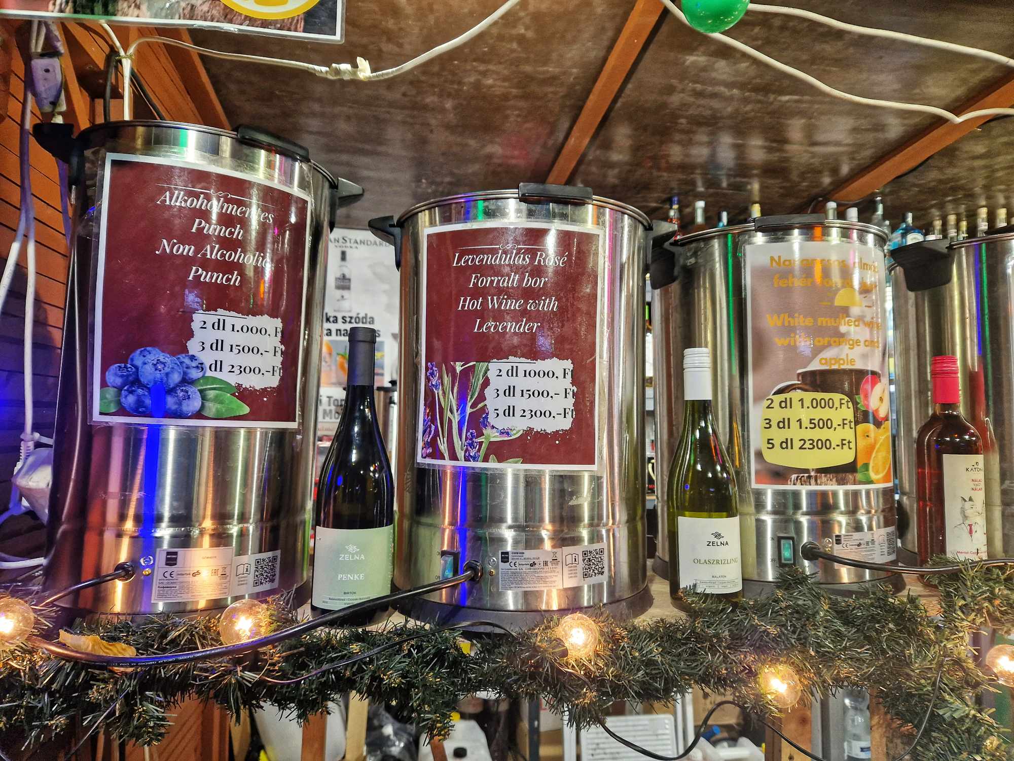 Advent Óbudán - A forralt vörösbor ára 1500 ft, a forró fehérbor Aperollal 1900 forintba, míg a forralt cider 1700 forintba kerül.