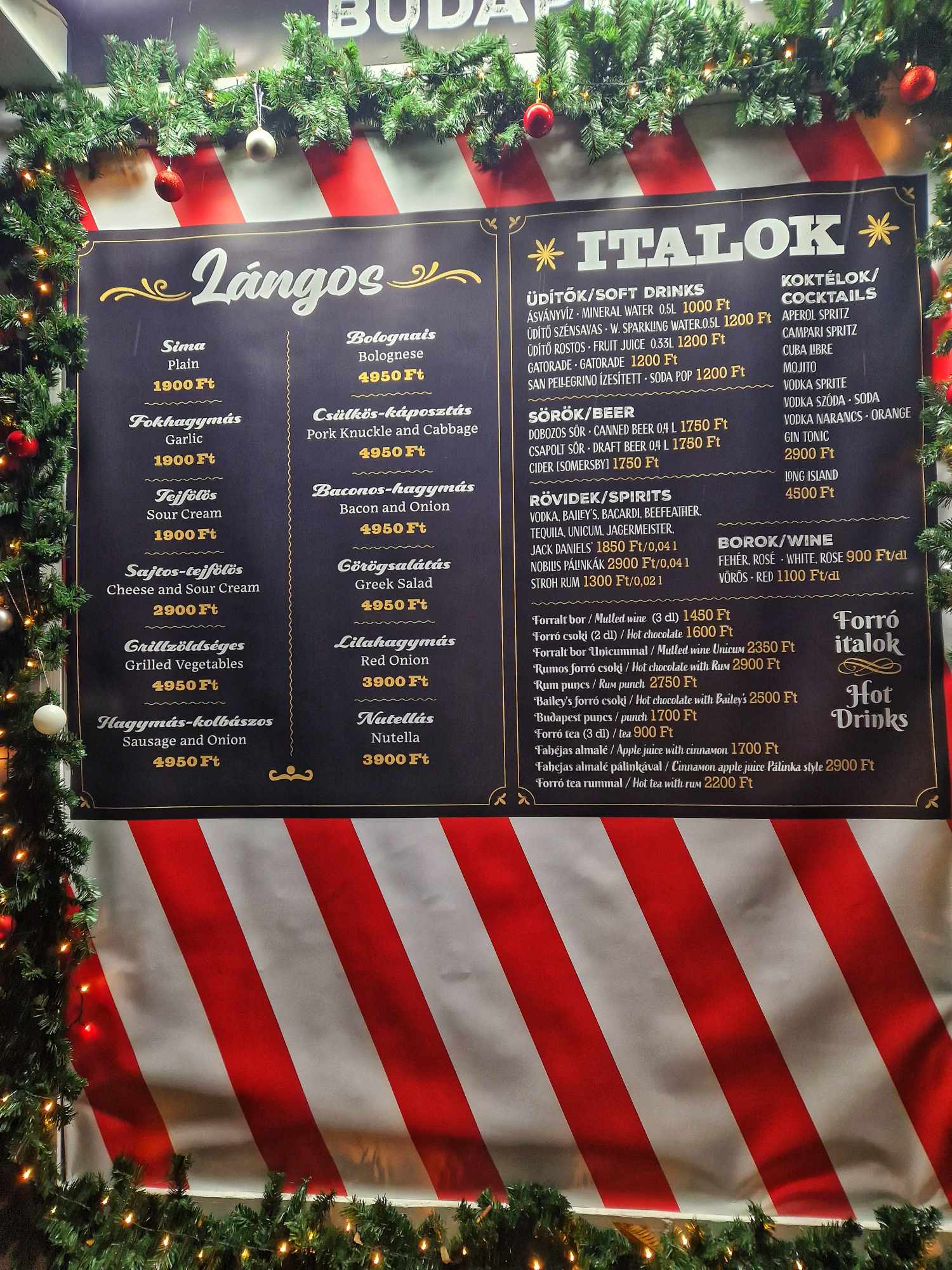 Adventi forgatag a Vároháza téren - Sertéspörkölttel vagy csirkepaprikással is is kérhetjük a lángost, ebben az esetben 4950 forintot kell fizetnünk. A röviditalok egységára 1850 forint.