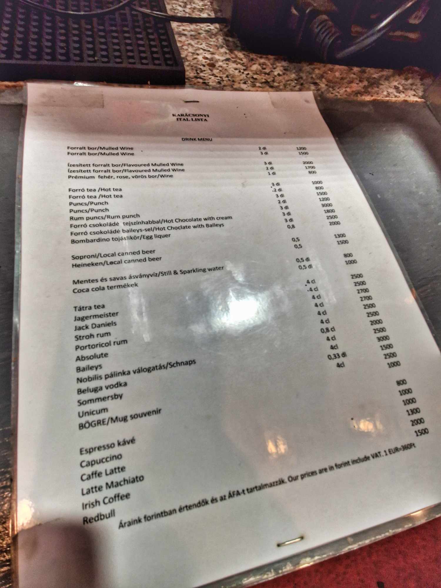 Adventi forgatag a Vároháza téren - 3 deci forró tea 1000 forint, 3 dl puncs 1500 forint, 3 dl forró csoki tejszínhabbal 1800 ft. A legolcsóbb sör a dobozos soproni, ez 1300 forint. A presszó kávé 800 ft-ba kerül.