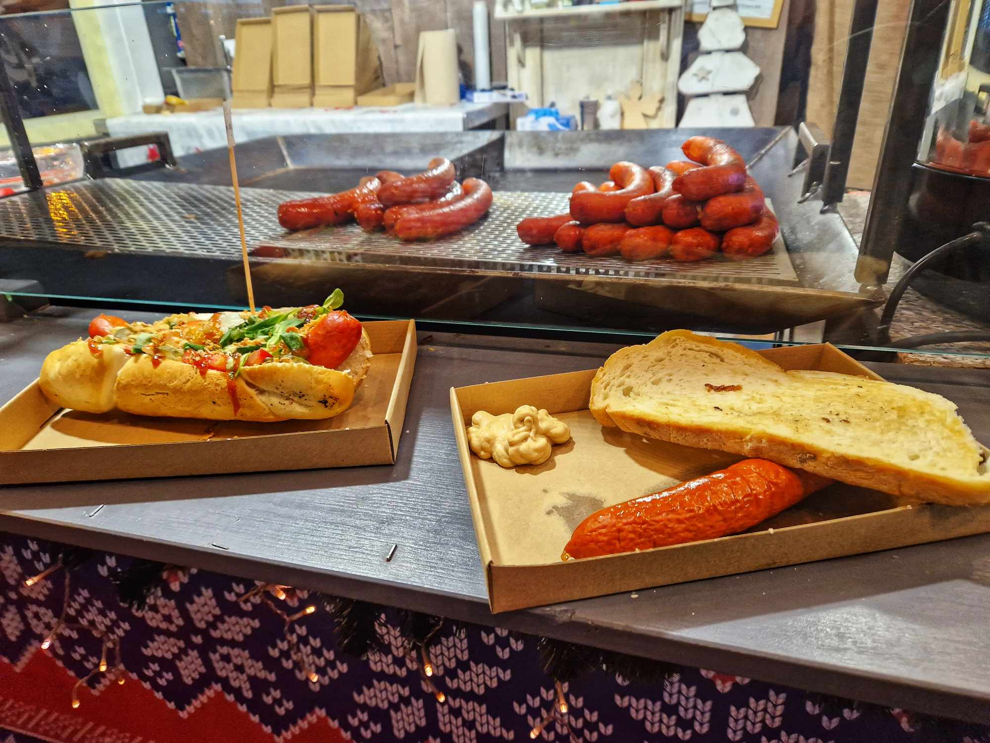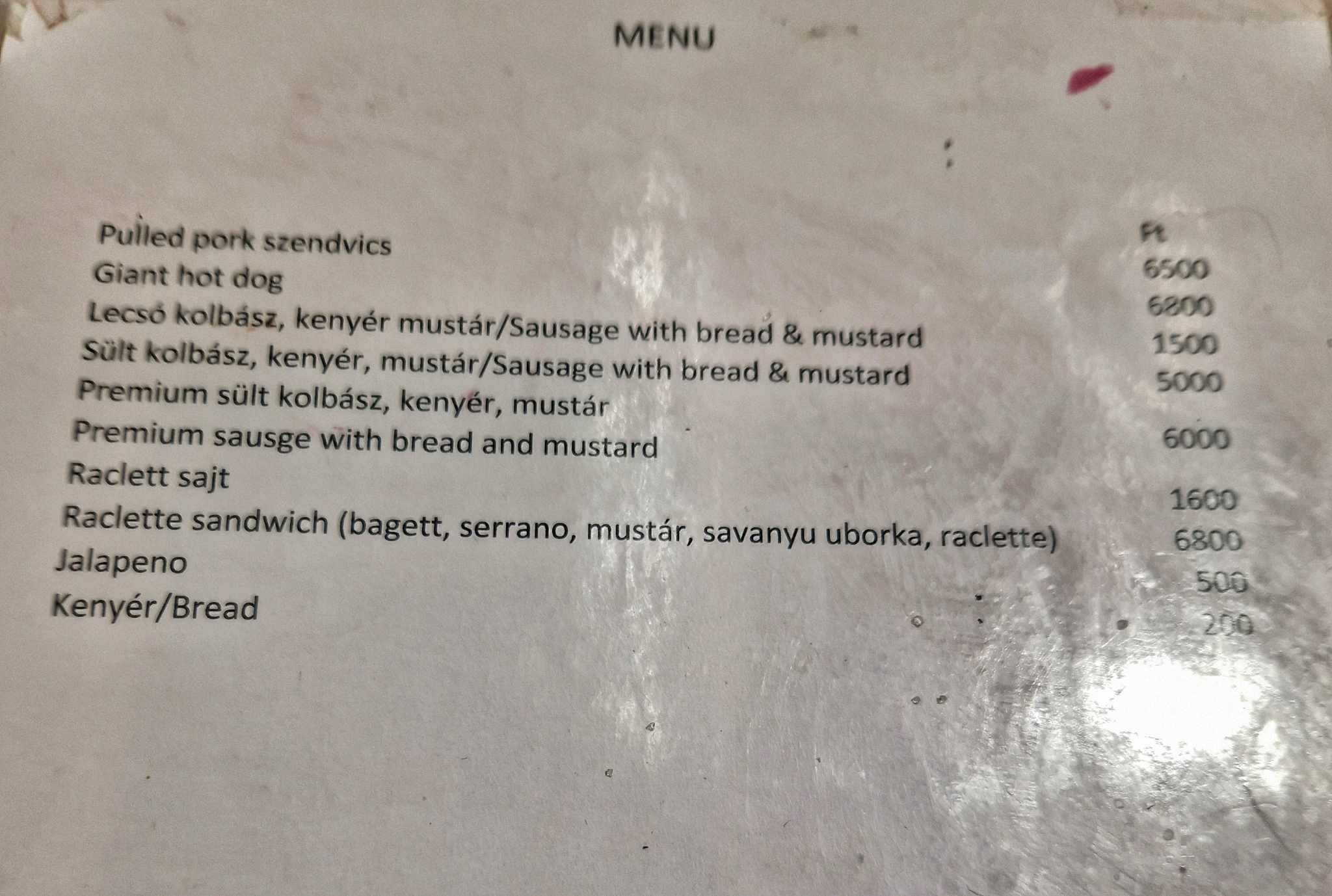 Adventi forgatag a Vároháza téren - A Pulled pork szendvics ára 6500 forint, a giant hot dog 6800 forintba, míg egy lecsókolbász 1500 forintba kerül. Egy szelet kenyeret 200 forintért vásárolhatunk mellé.