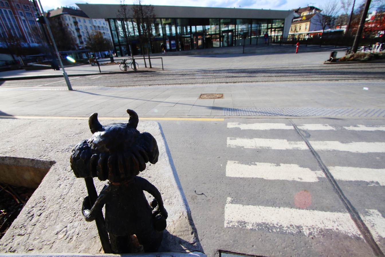 A Széll Kálmán teret pásztázó Mekk Elek miniszobor