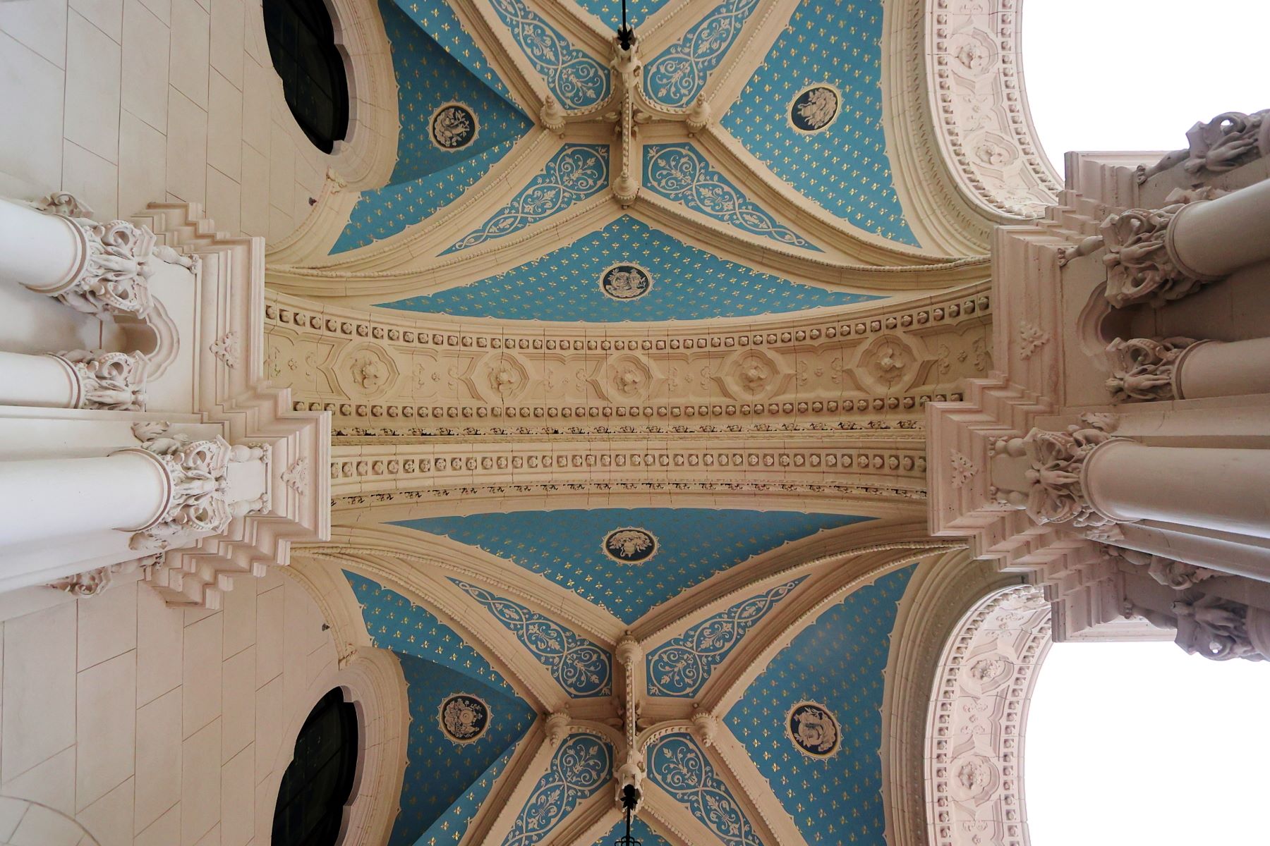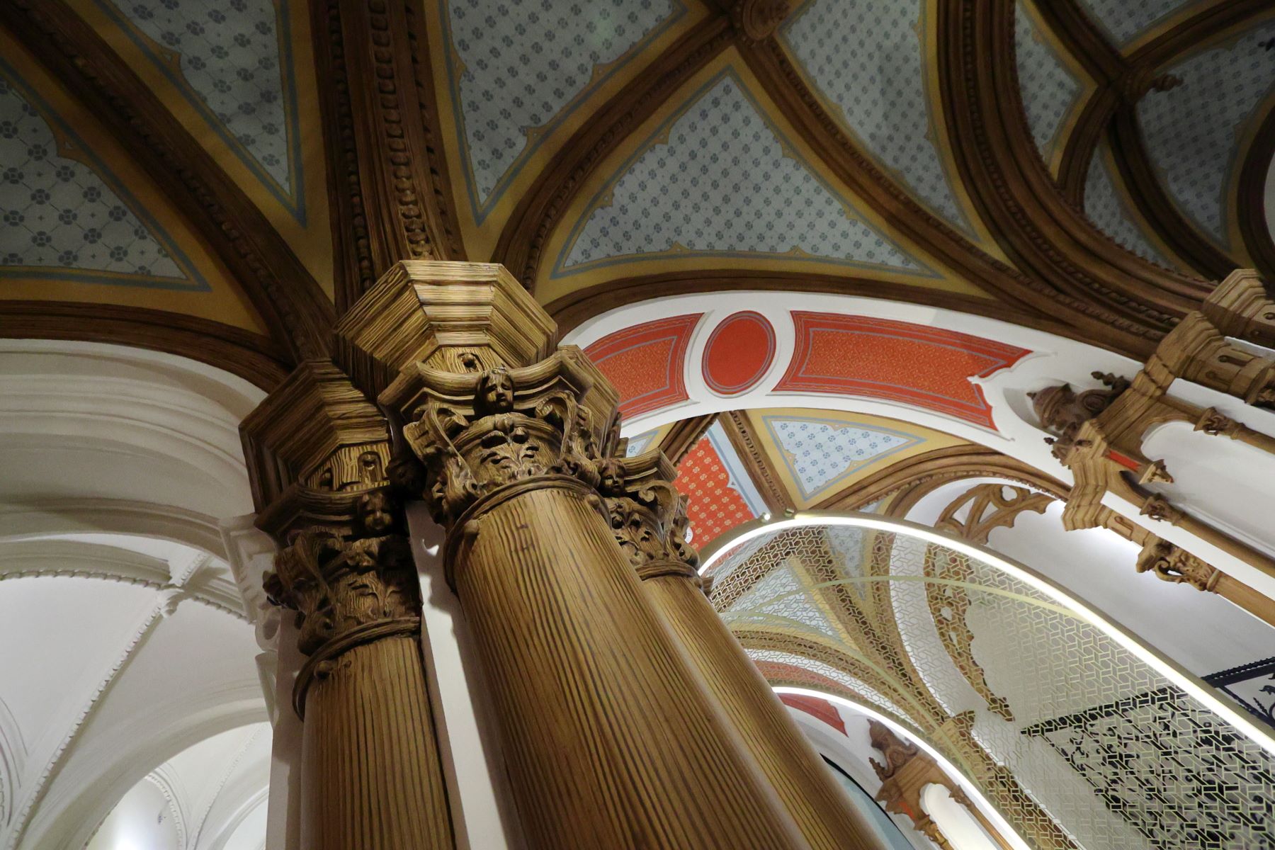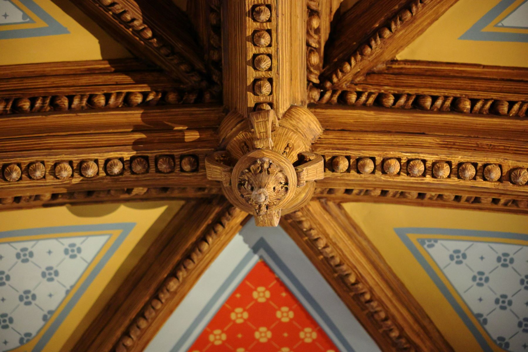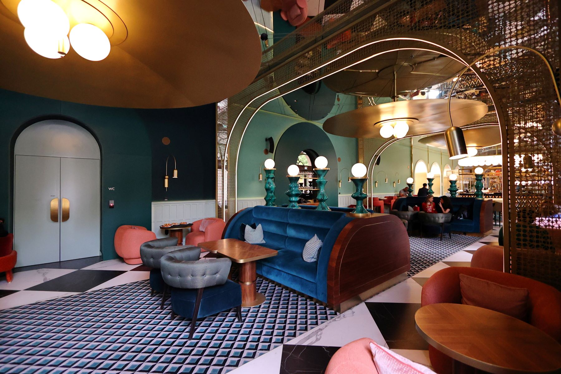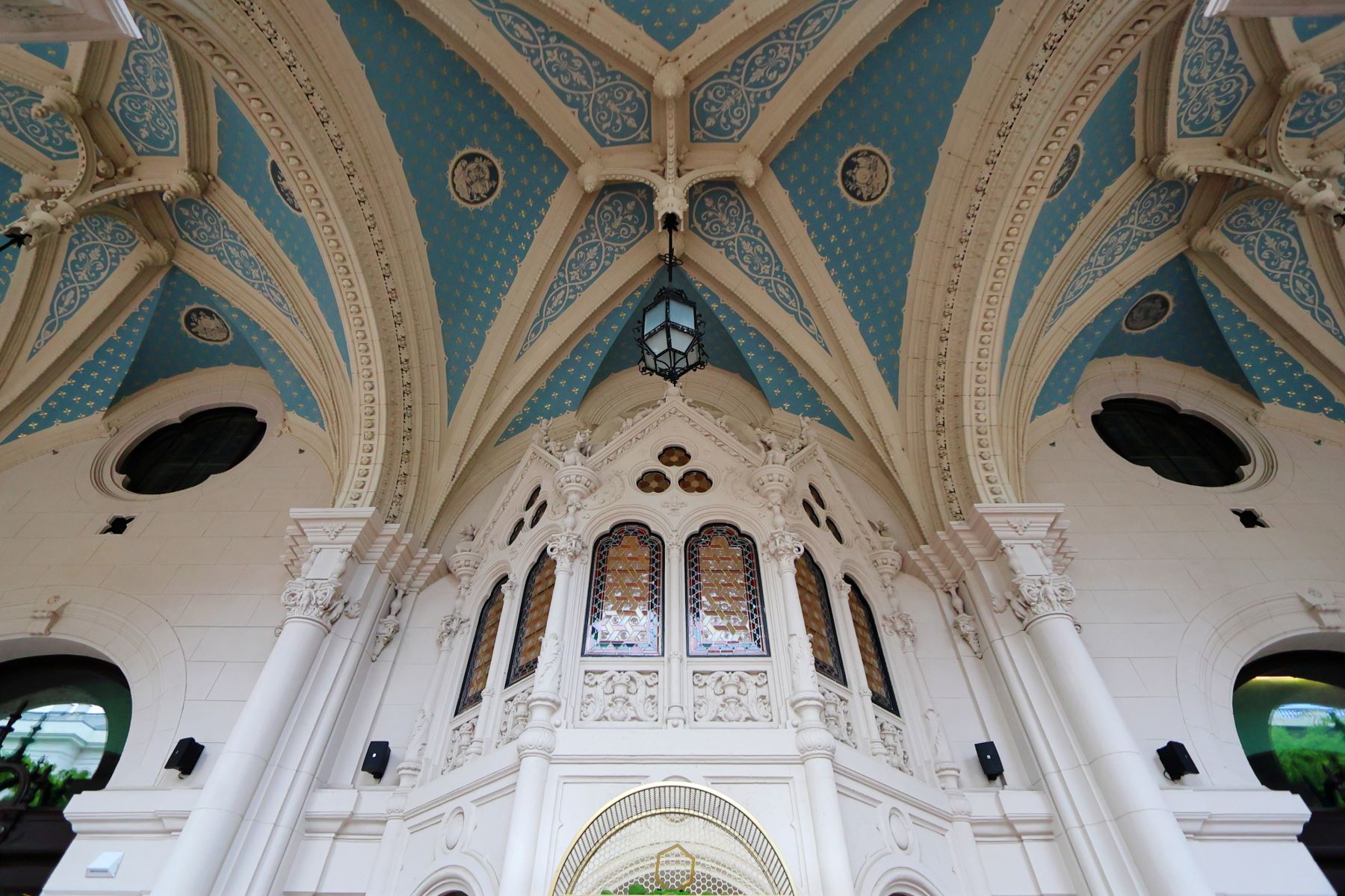 A Drechsler-palota kék eget imitáló árkádsor-mennyezete magáért beszél. A kerek piktogrammokon teáscsésze látható, utalva a vendéglátóipari mivoltra.