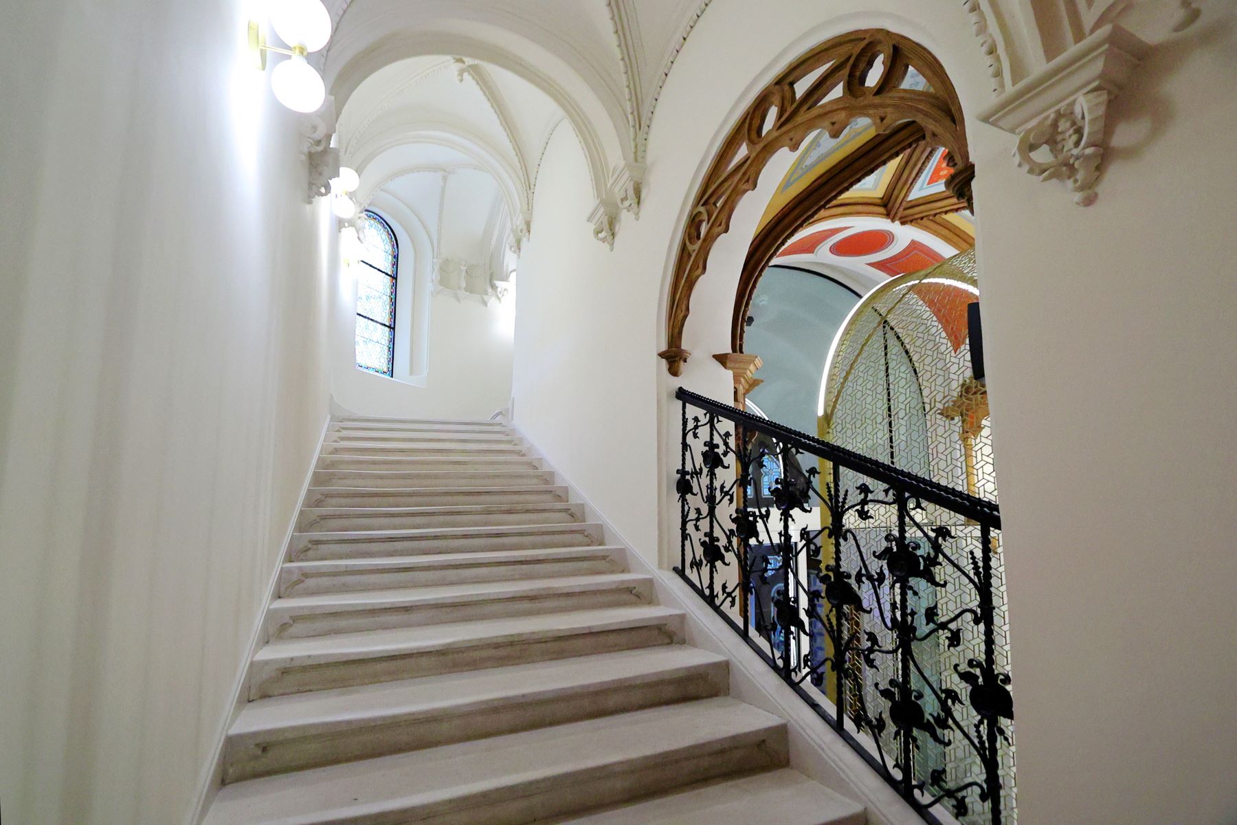A Drechsler-palota elegáns oldal lépcsőháza induló része jobb kanyarral ráfordul a főlépcsőházra.