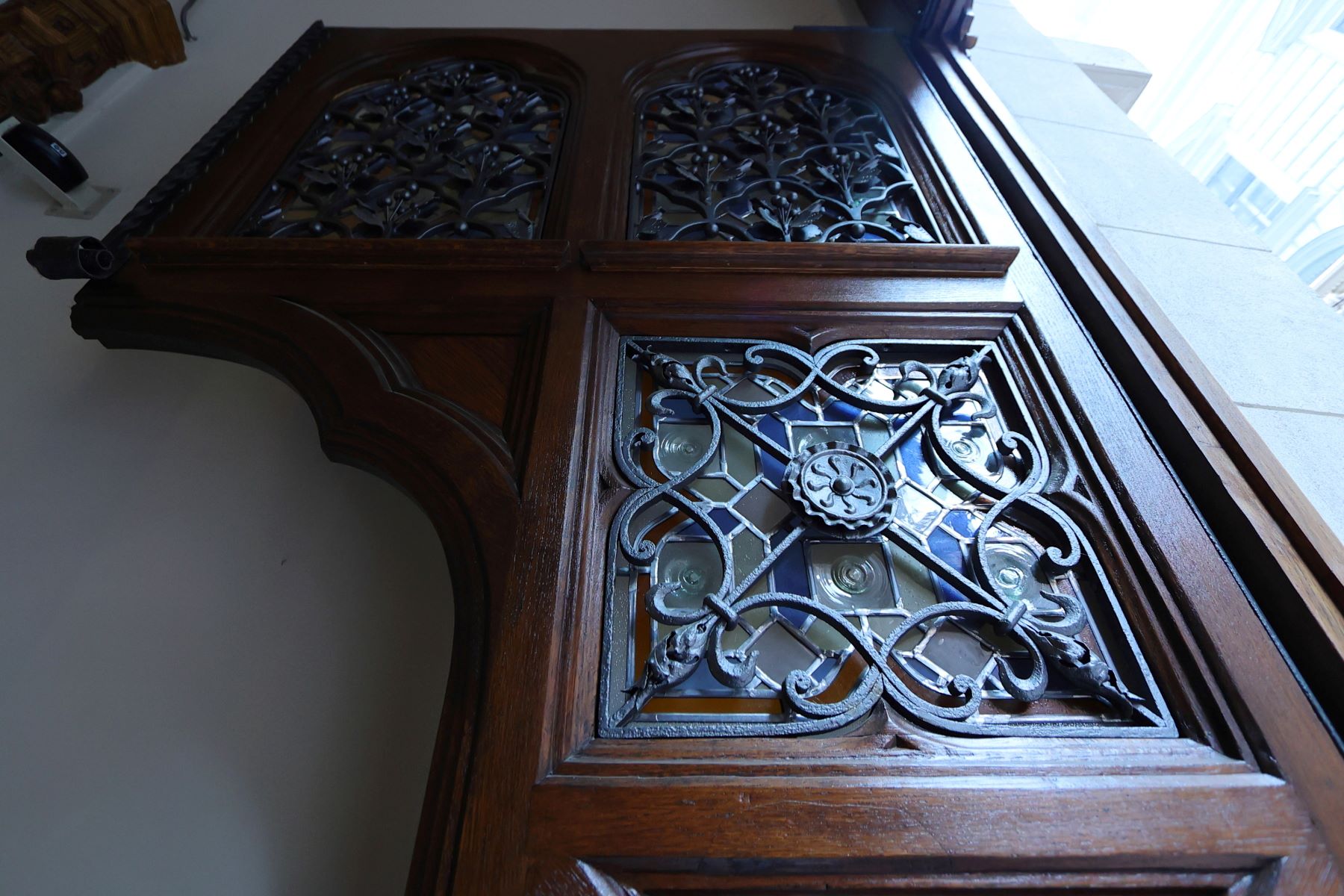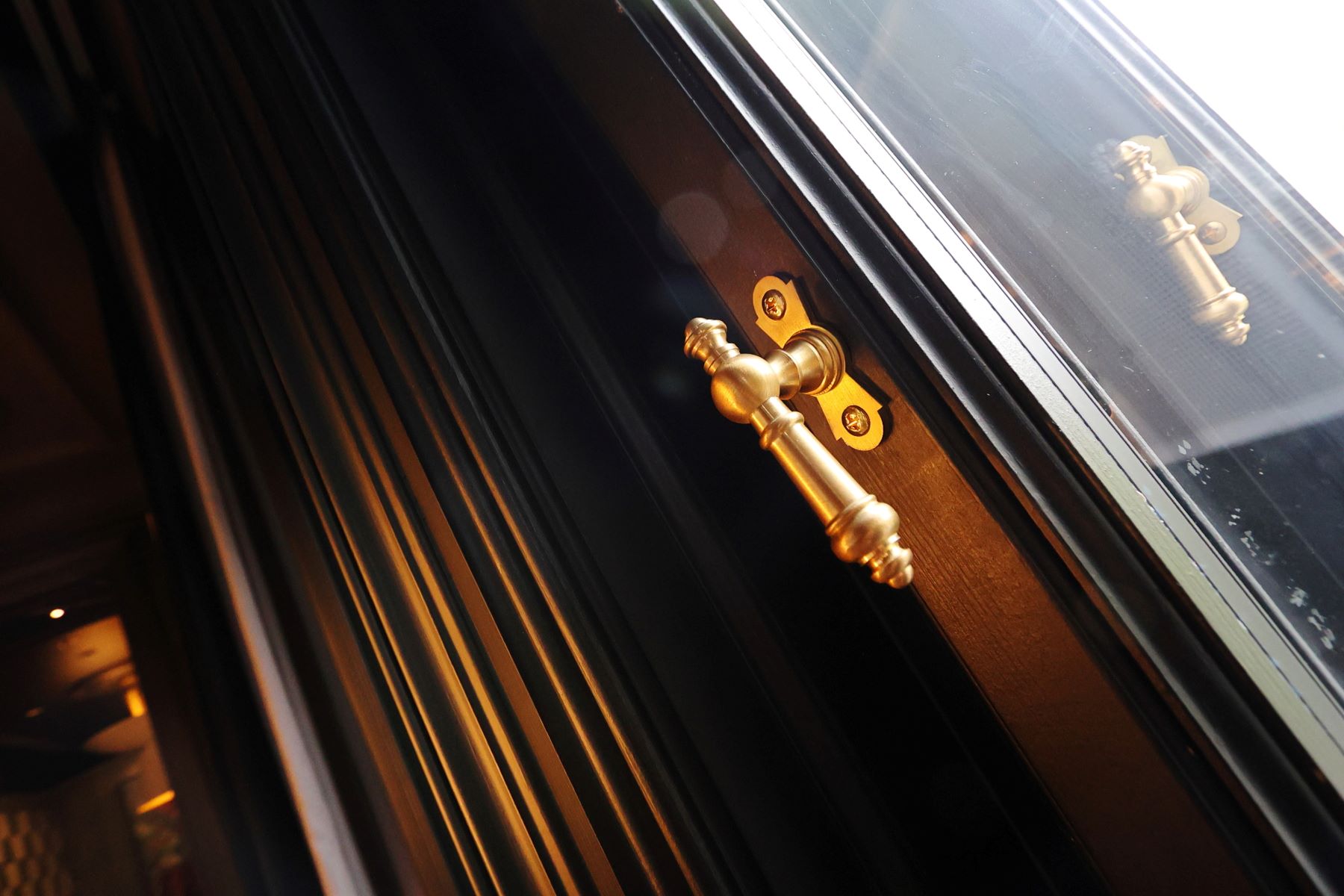 Az épület felújítása során minden apró részletre figyeltek. Látható a nyílászáró minősége, illetve a korhű kilincs.