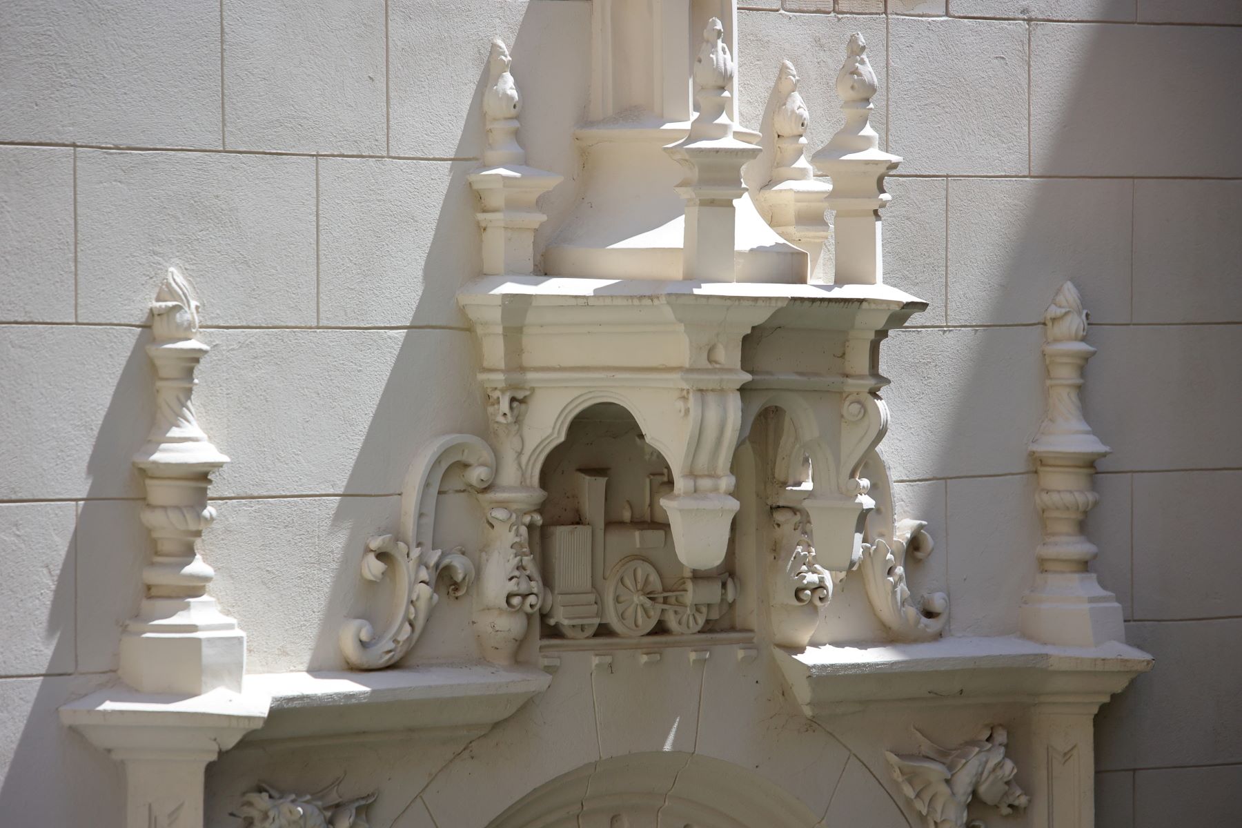 A belső udvar másik ikonja a falból kiugró díszlábazat alatti mozdony, szintén az építtetőre, a MÁV-ra utal.
