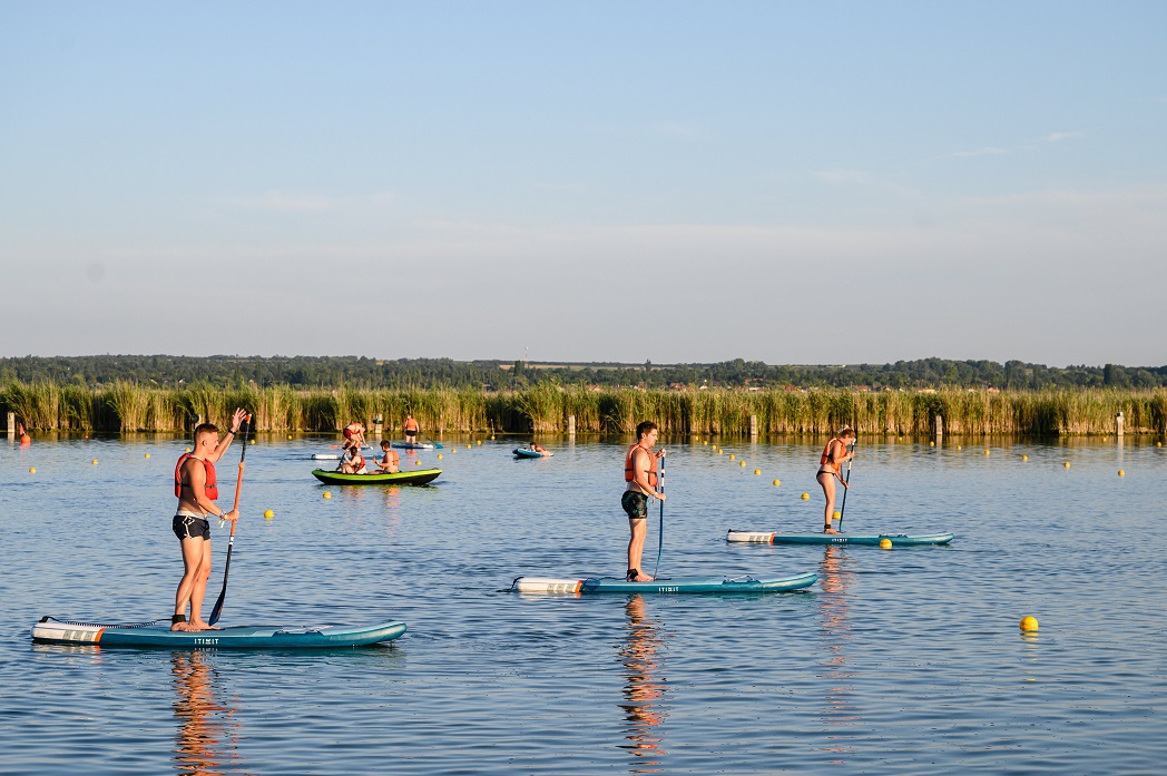 Fesztiválozók állószörföznek (SUP) az Egyetemisták és Fõiskolások Országos Turisztikai Találkozóján (EFOTT) a Velencei-tavon Sukorónál 2021. augusztus 10-én. MTI/Vasvári Tamás