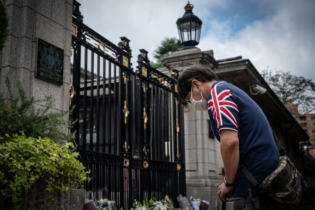 Egy nő virágokat helyez egy a brit nagykövetségnél Japánban, Tokióban (Fotó: Yuichi YAMAZAKI / AFP)