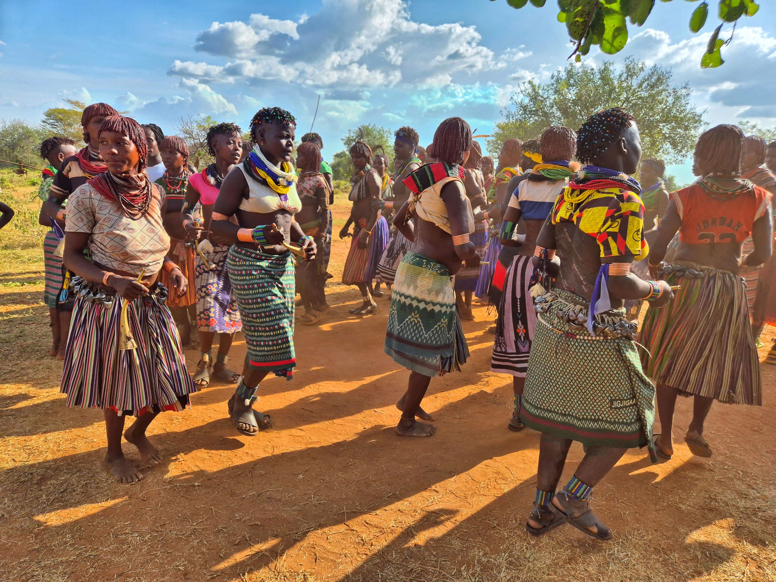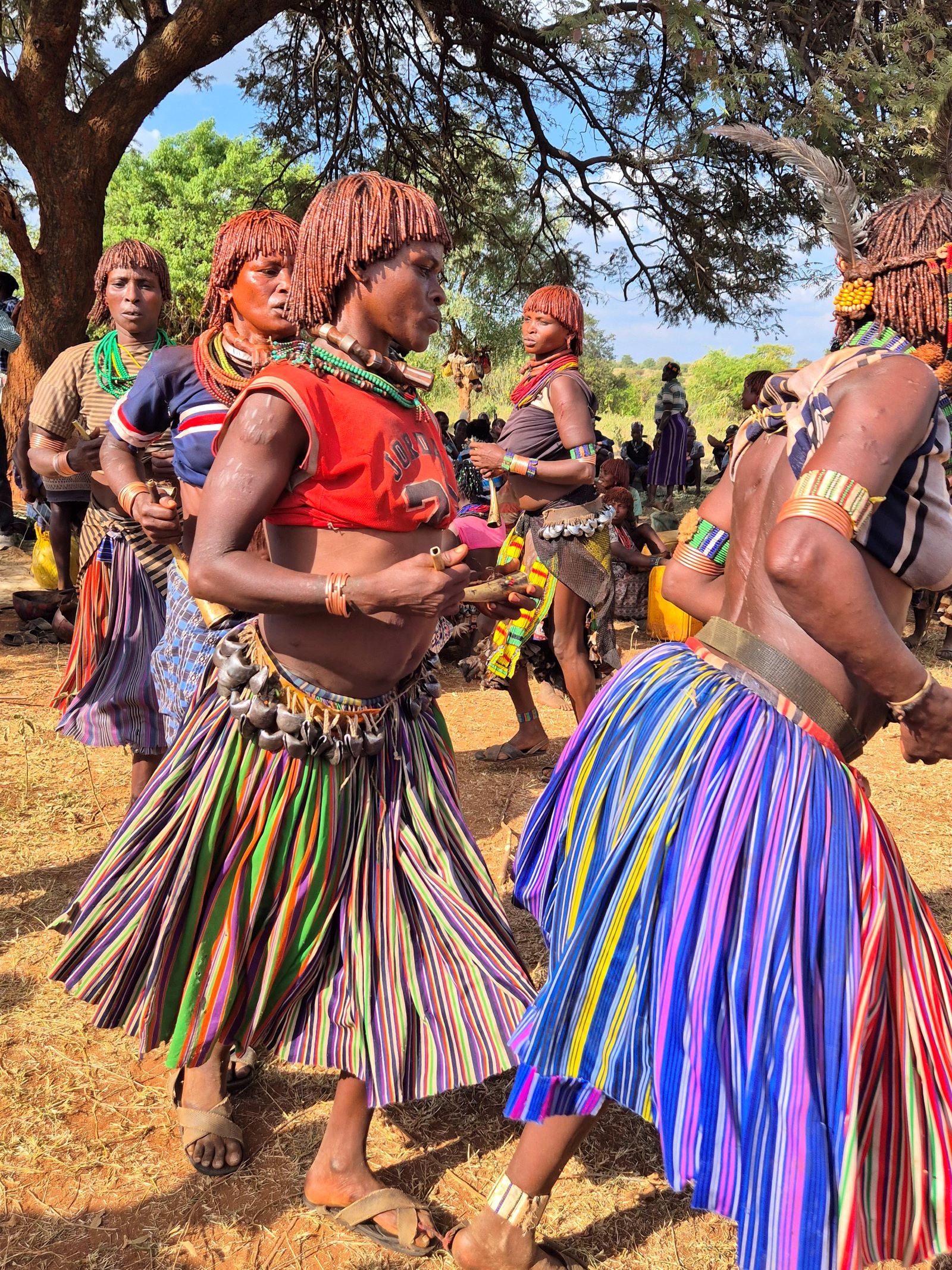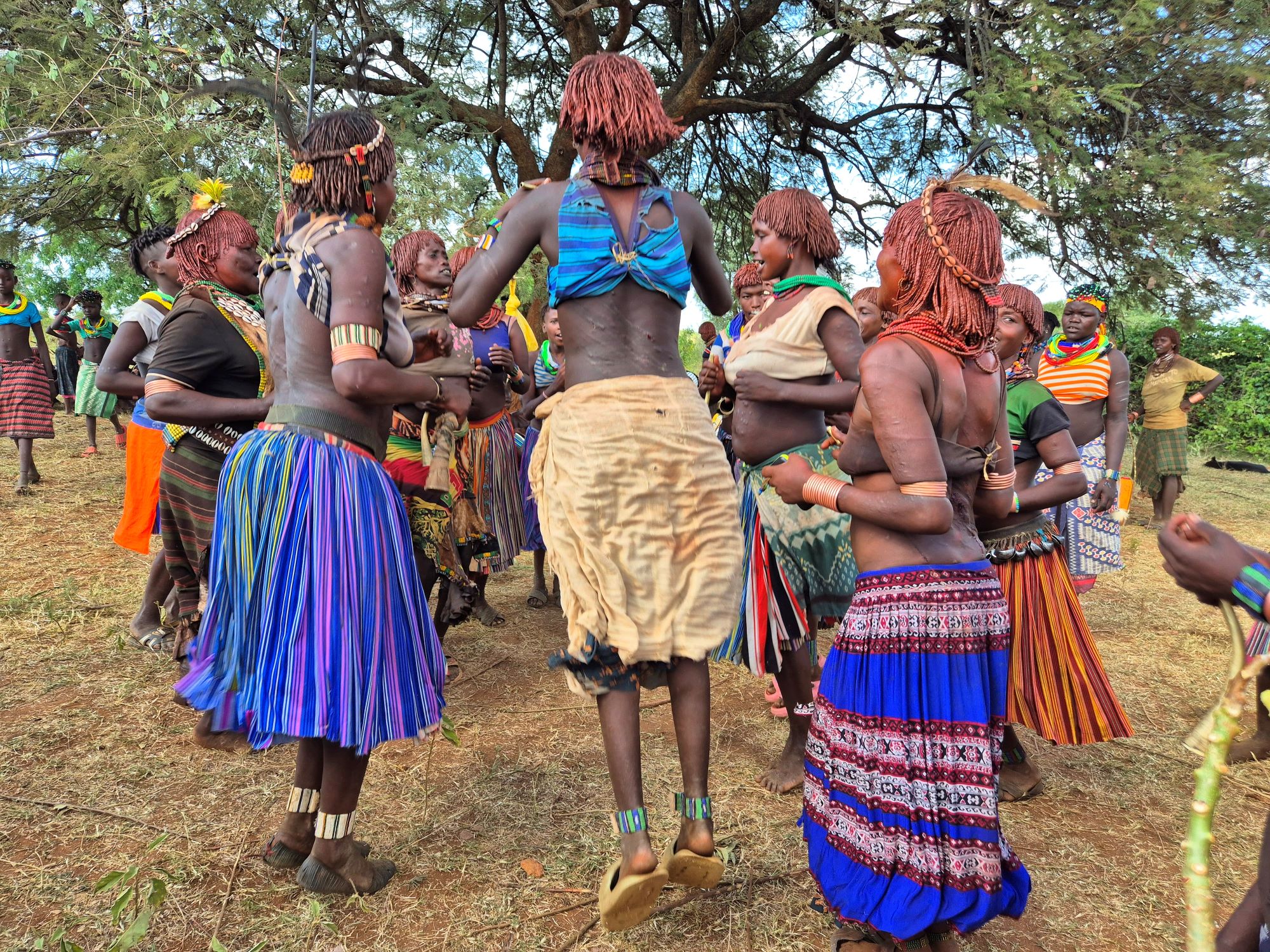 Egy nagy, árnyékos fa alatt házi sört iszogattak a férfiak, körülöttük pedig több tucat nő táncolt. Nagyon energikus, vad táncolt jártak, énekelve, ugrálva. A hangzavart kürtök és a lábakra kötött kolompok és csengettyűk is fokozták. Időnként 2-3 nő addig provokált egy férfit, amíg az egy vesszővel nagyot sújtott rájuk. Ez a vesszőzés a férfi rokonok iránti elkötelezettségüket és hűségüket jelképezi. A nők haja is különleges: okkersárga agyaggal és vajjal göndörítik, festik a hajukat és ennek elég jellegzetes (nem kellemes) a szaga.