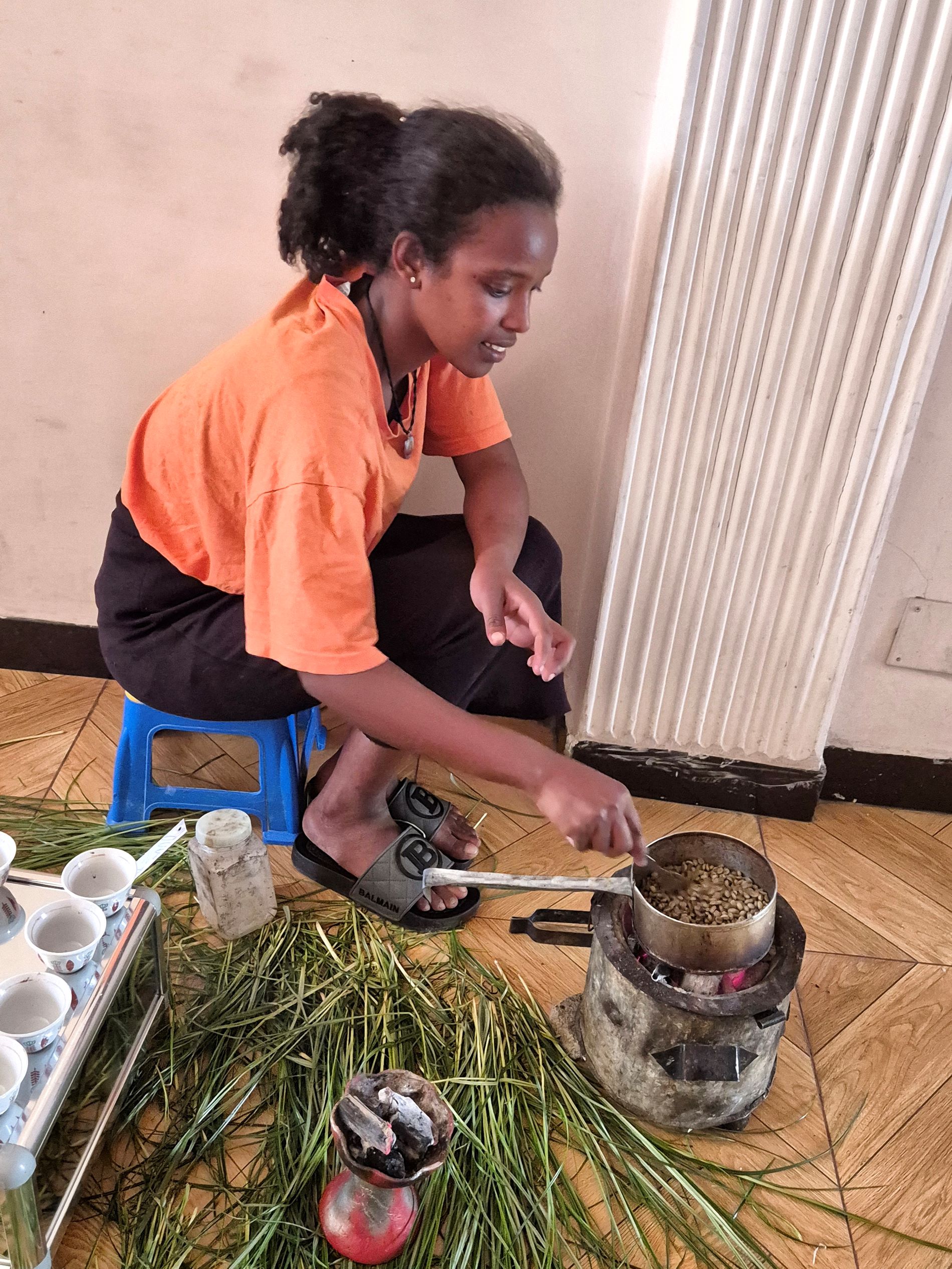 Először a megmosott kávébabokat pörkölik meg egy serpenyőben, amíg azok feketék és olajosak nem lesznek. Mindezt nyílt tűzön teszik a vendégek előtt. Ezután a házigazda körbeadja a serpenyőt, hogy a vendégek megérezhessék a frissen pörkölt kávé illatát. Hogy még illatosabb legyen a levegő, általában friss virágokat és füvet szórnak a padlóra, valamint füstölőt égetnek. Ezt követően a kávébabot fából készült mozsárban őrlik meg, amíg kávéőrlemény nagyon finom nem lesz.