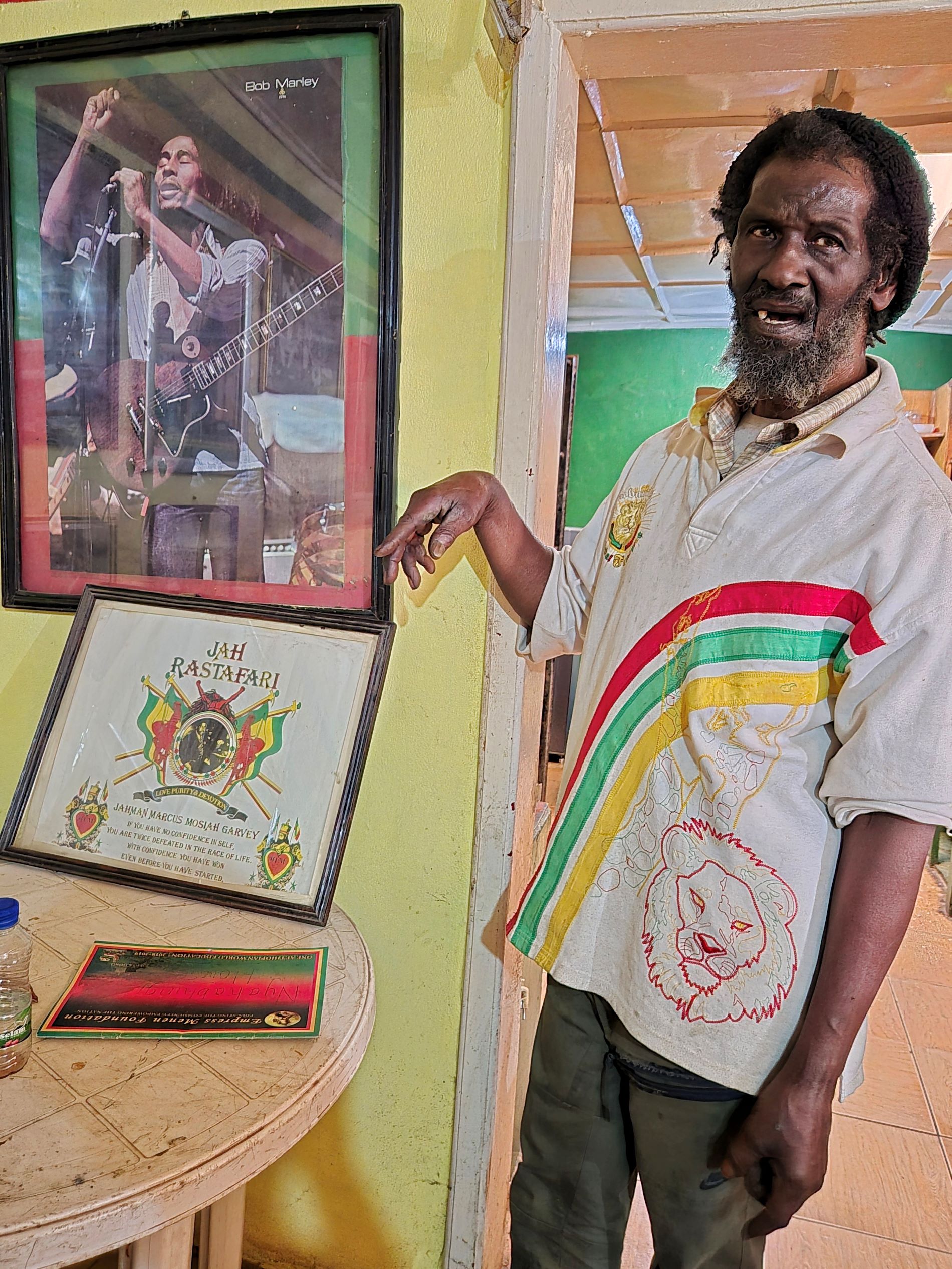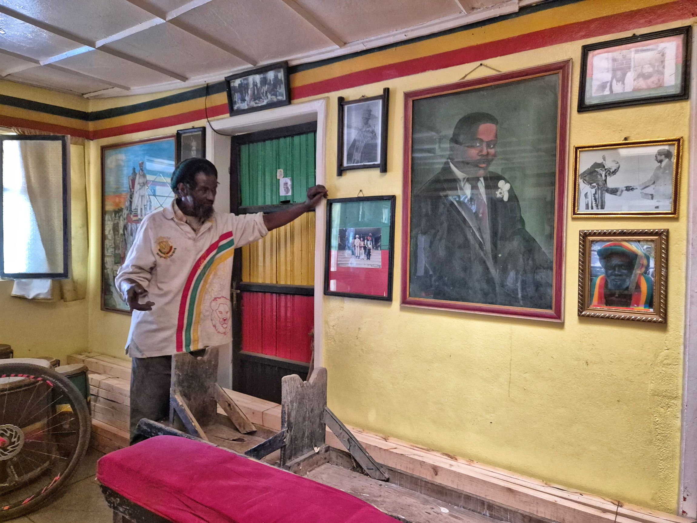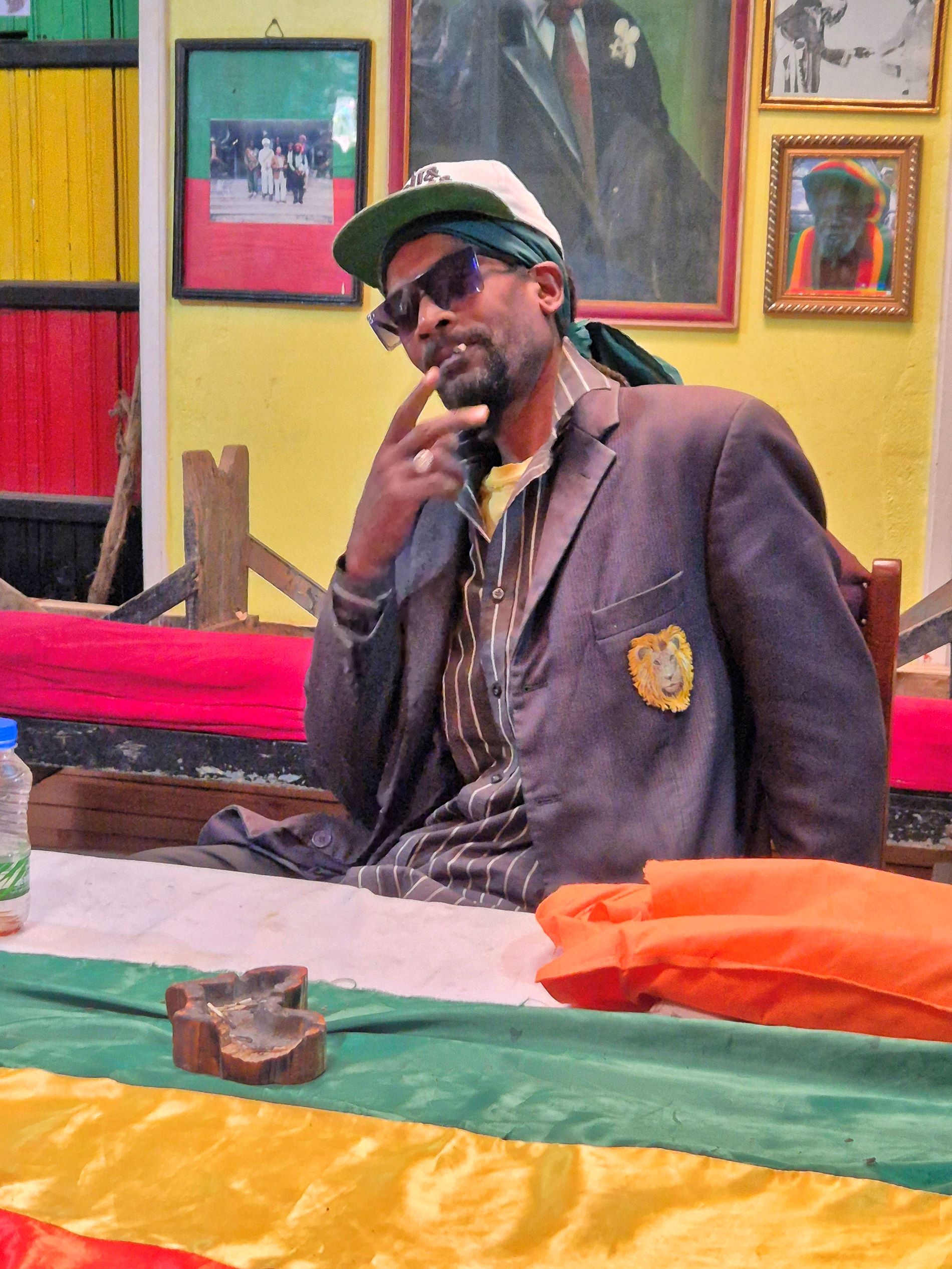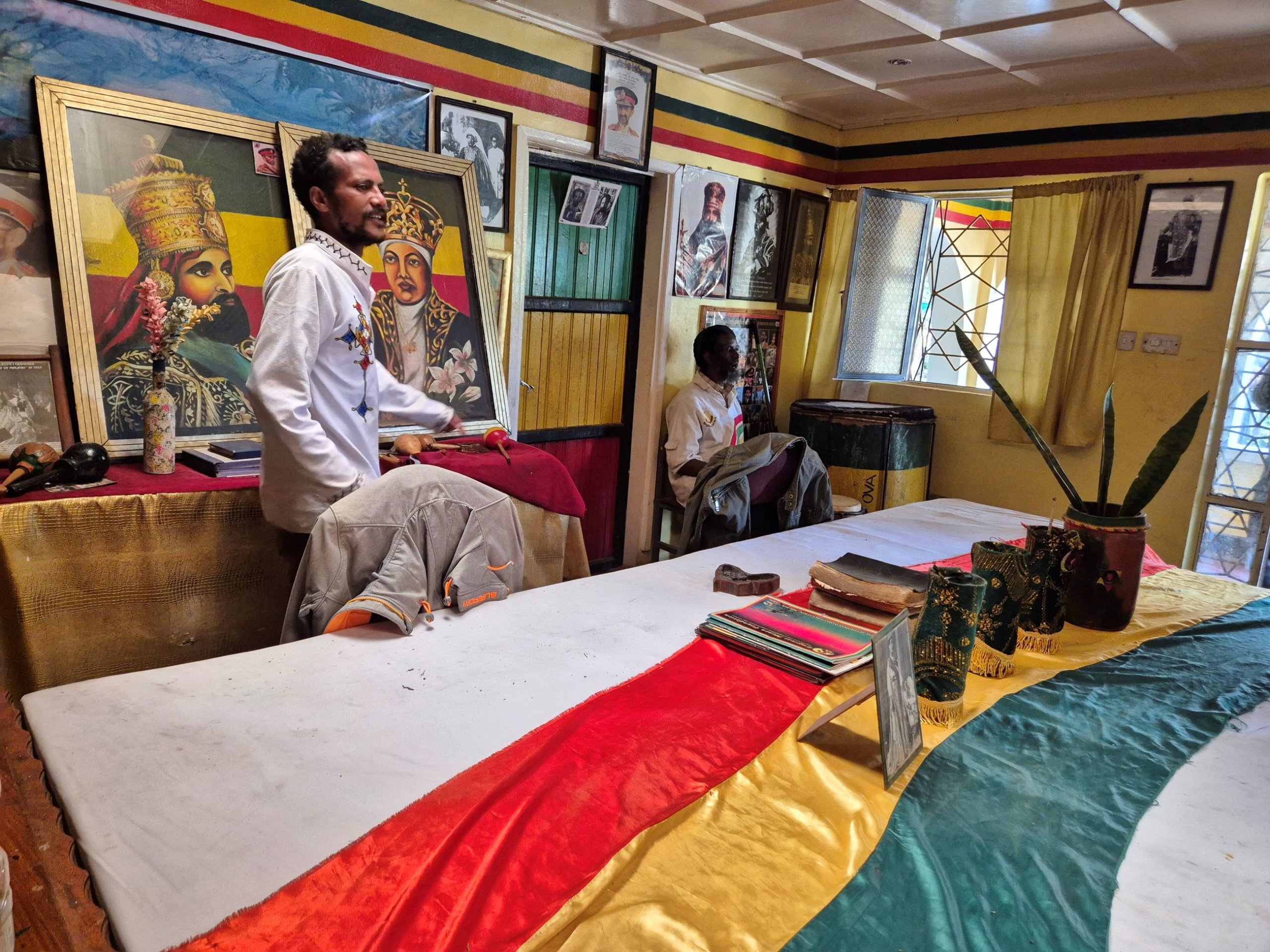 Megérkezve a templomba, a szertartásoknak helyet adó épületbe nem mehettünk be, azt ugyanis épp felújítják. Behívtak viszont egy másik helyiségbe, melynek falai képekkel volt tele. Itt egy teljesen beállt helybéli végigmutogatta a kitett fotókat és mindről mesélt egy kicsit. Gyakorlatilag az uralkodóhoz kötődött a legtöbb, szóval egy idő után leesett nekünk, hogy ez amolyan szentély volt. A helyiség közepén egy nagy asztal állt, körben szedett-vedett lócák, fotelek és néhány napszemüveges, réveteg tekintetű fickó szívta a marihuánás cigit. Az „idegenvezetés” végén megkértek minket, írjuk alá a vendégkönyvet, adjunk adományt és szívjunk velük együtt egy kis füvet… meglehetősen ritka kérés egy egyházi épületben.