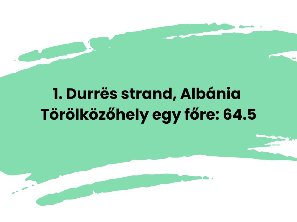 A lista első helyén az albániai Durrës strand szerepel, a vizsgált tengerpartok közül ez a legkevésbé zsúfolt. Bár a strand népszerű célpontnak számít, mégis nyugodt hangulatot áraszt, és bőséges helyet kínál a látogatóknak – egy főre majdnem 65 törölközőnyi terület jut. Ideális választás lehet családoknak is, akik pihenésre vágynak az Adriai-tenger partján. Albánia egyébként évről évre egyre népszerűbb úti céllá válik, hiszen természeti szépségei és kedvező árai vonzzák a turistákat.