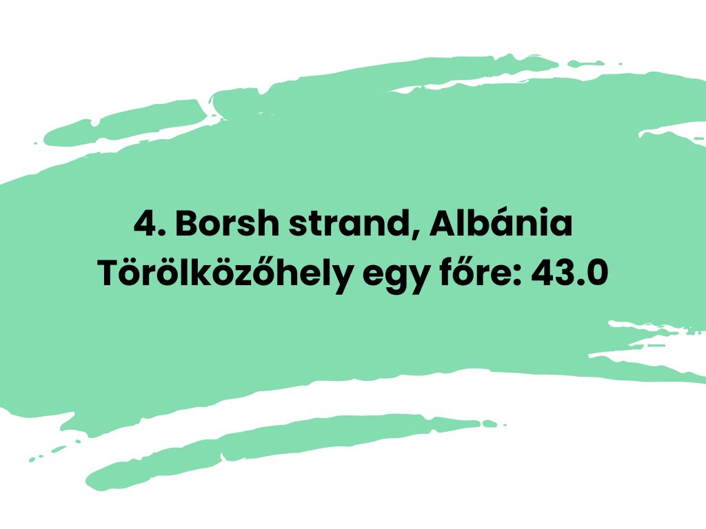 A negyedik helyen egy újabb albániai gyöngyszem szerepel, méghozzá a Borsh Beach, ami az ország egyik leghosszabb és legszebb tengerpartja. A számítások szerint itt körülbelül 43 törölközőnyi hely jut egy főre. Mint sok más albán strand, ez is viszonylag érintetlen és kevésbé zsúfolt, így ideális választás azoknak az utazóknak, akik nyugalomra és természetközeli élményekre vágynak. Természeti szépsége és békés hangulata miatt tökéletes hely a pihenésre.